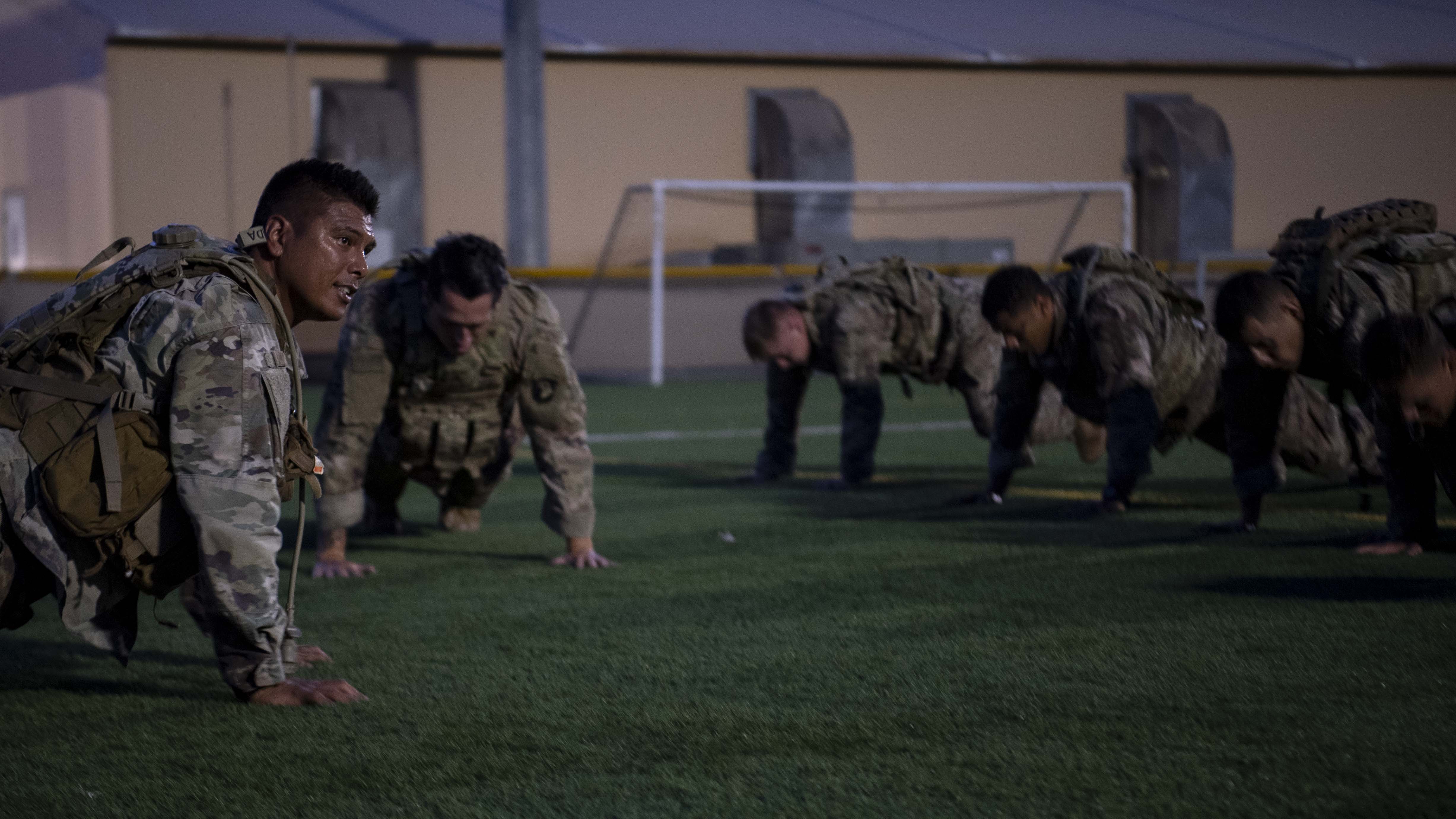A U.S. Army Soldier from the 101st Division, 2nd Battalion, 506th Infantry Regiment, East African Response Force (EARF), leads his platoon in eight-count pushups during the EARF’s best platoon competition at Camp Lemonnier, Djibouti, Oct. 25, 2019. During the competition Soldiers completed a two-mile run, 25 meters of lunges, burpee long jumps and high crawls before finishing with 10 eight-count push-ups. (U.S. Air Force photo by Staff Sgt. J.D. Strong II)