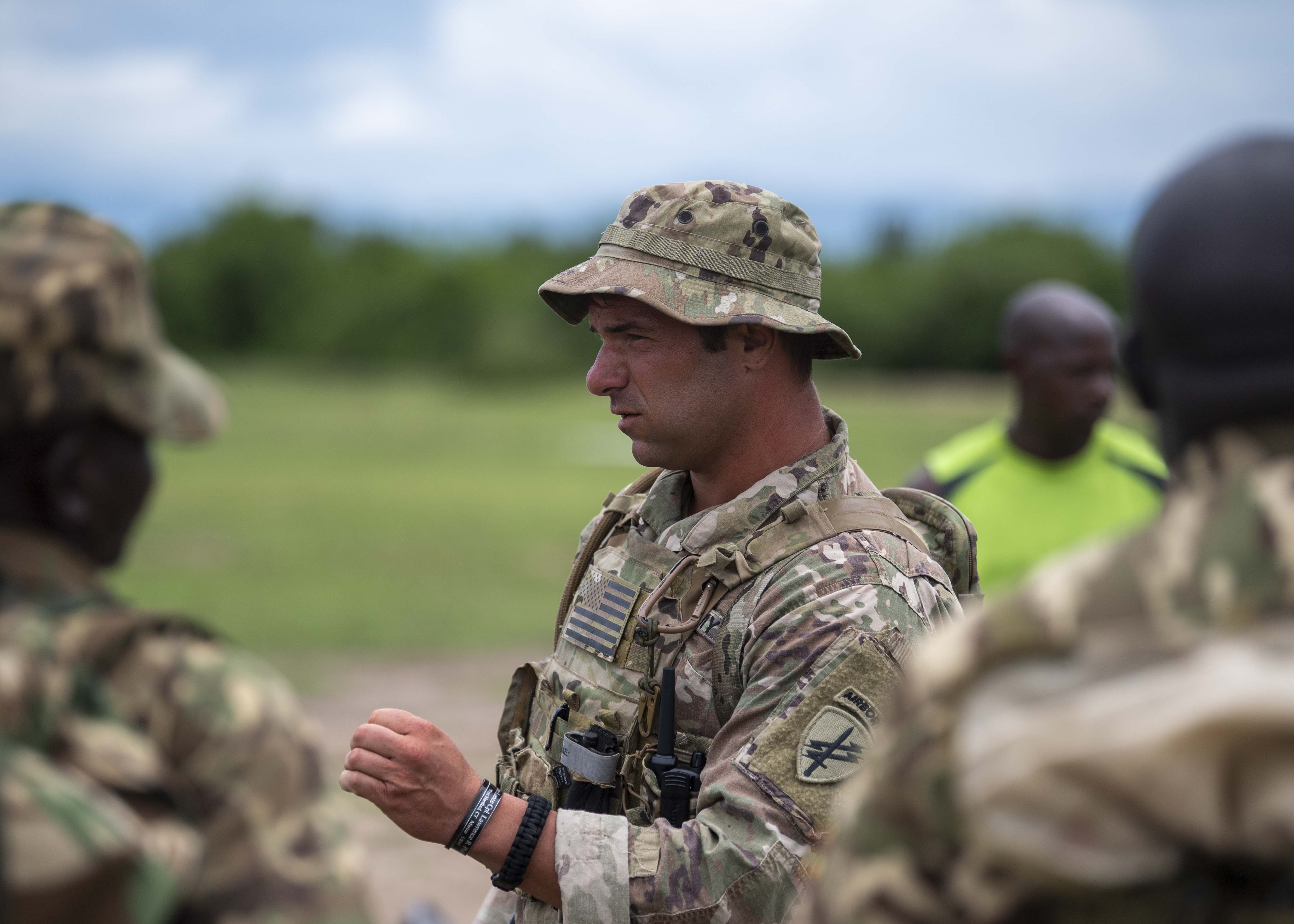 U.S. Army Sgt. Jason Kunkle, instructor, 403rd Civil Affairs Battalion assigned to Combined Joint Task Force-Horn of Africa writes a team evaluation during a Counter Illicit Trafficking Junior Leadership Course examination at Queen Elizabeth Park, Uganda, Oct. 10, 2019. Kunkle was one of six instructors who taught Uganda Wildlife Authority (UWA) Rangers how to conduct land navigation, conduct small unit tactics, respond to wildlife crimes, ethics and medically treat a casualty. (U.S. Air Force photo by Staff Sgt. J.D. Strong II)