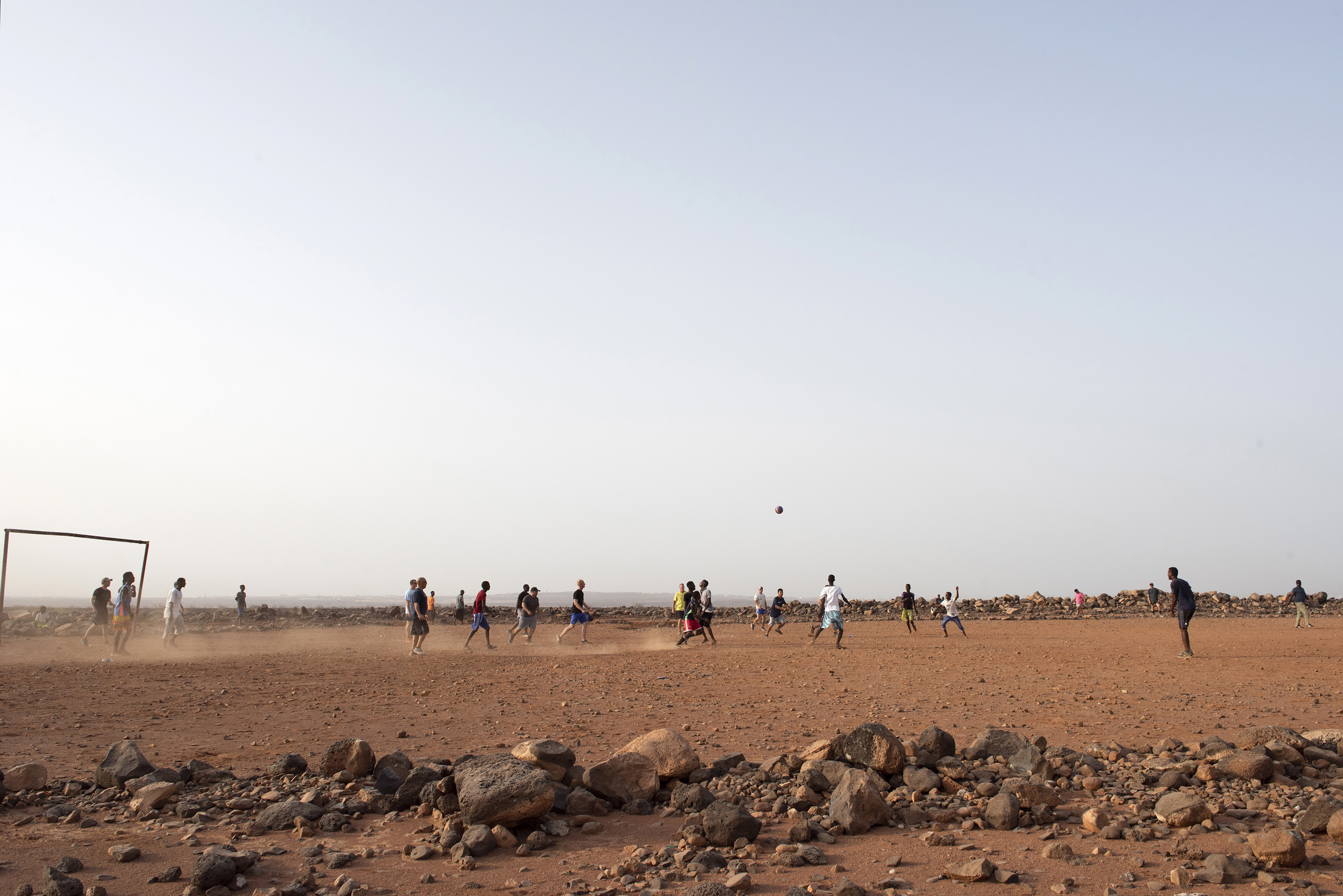 Djiboutian children from Chebelley Village play soccer outside of Chebelley Village, Djibouti, Aug. 3, 2018. The 404th Civil Affairs Battalion organized an outreach event that included 30 service members from Combined Joint Task Force - Horn of Africa. (U.S. Air National Guard photo by Master Sgt. Sarah Mattison)