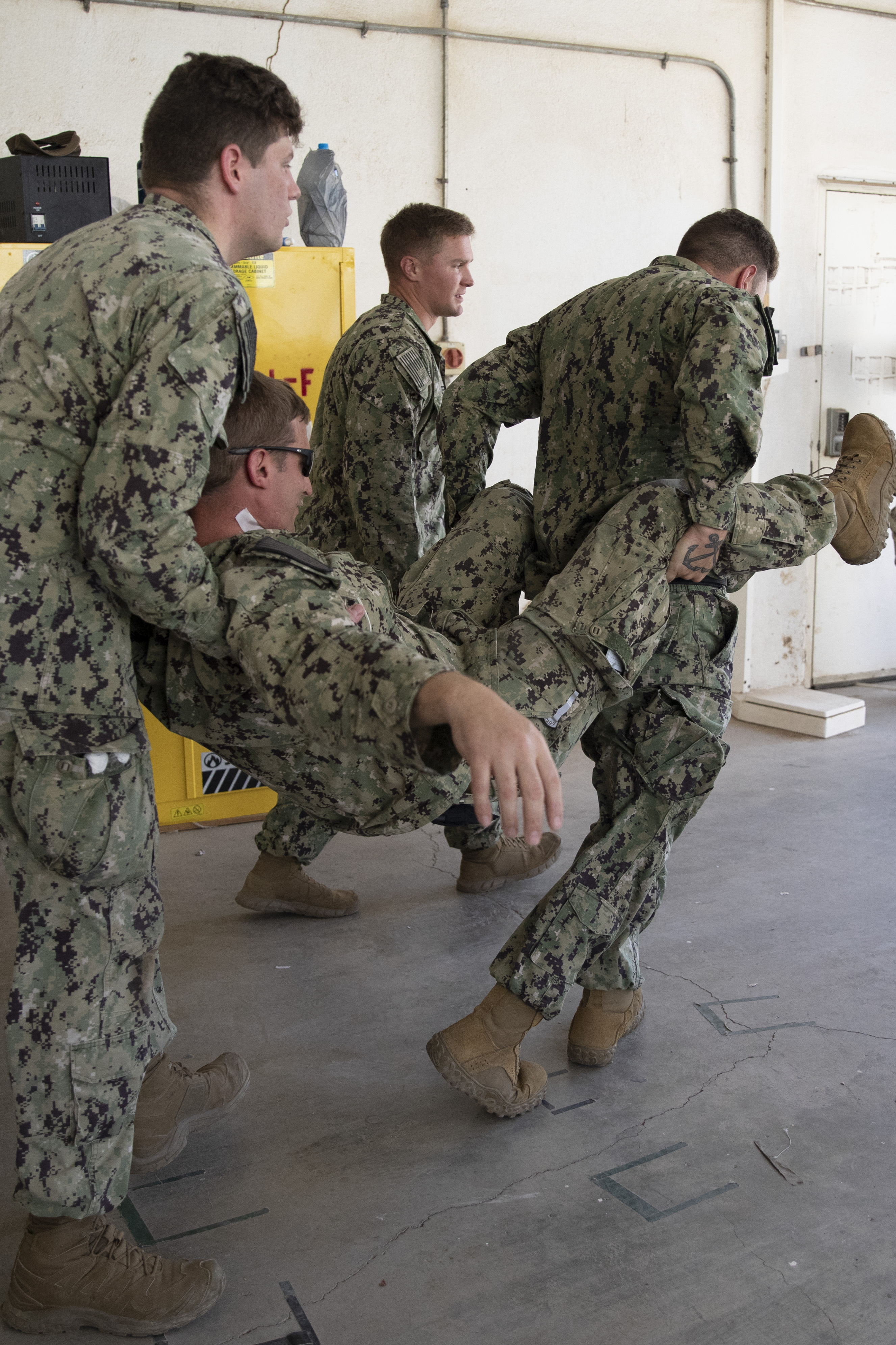 U.S. Navy Sailors attend a combat lifesavers course hosted by Combined Joint Taks Force – Horn of Africa at Camp Lemonnier, Djibouti, Feb. 20, 2025. The course was designed to simulate a ship. They learned various techniques such as placing a chest decompression needle, packing a wound and wrapping it with medical bandages to control bleeding. (U.S. Army photo by Spc. Micheala Maldonado)