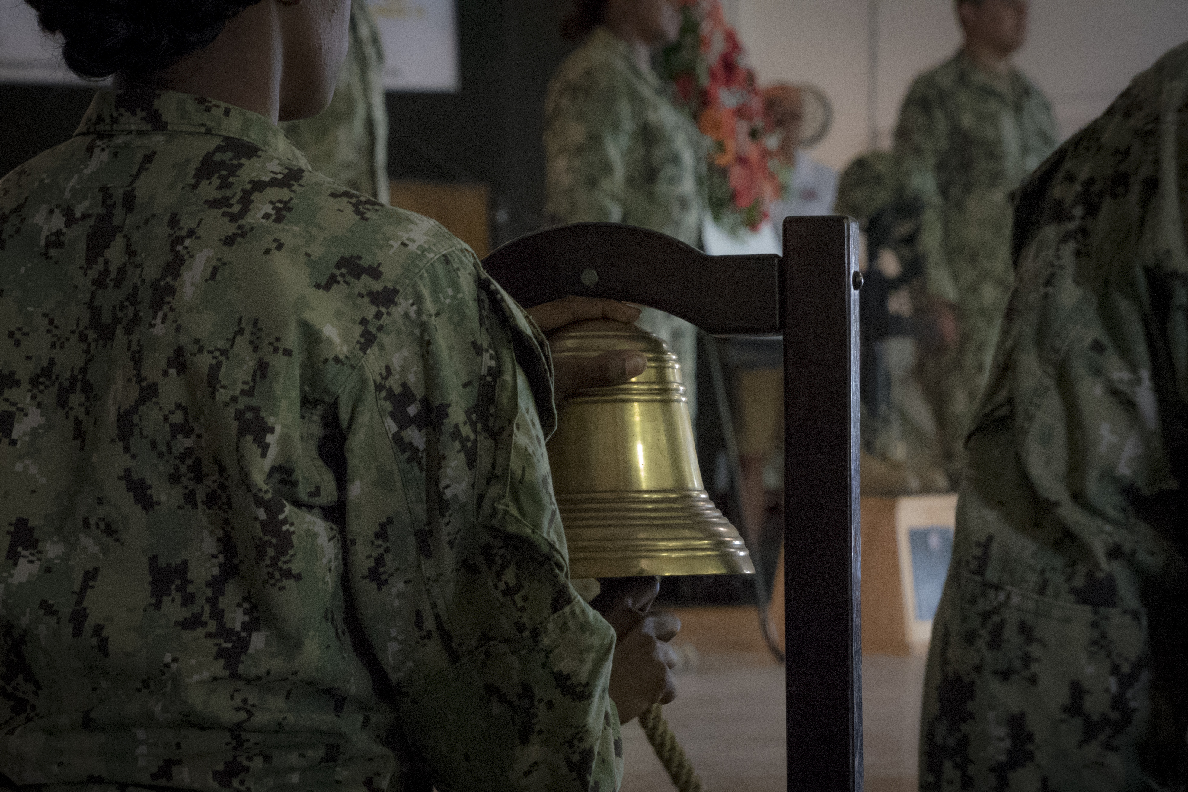 The bell tolls between the names of the fallen as Naval Mobile Construction Battalion One (NMCB-1) of the Combined Joint Task Force-Horn of Africa (CJTF-HOA) Djibouti, are holding a Wreath Laying Memorial Service, May 2, 2017, at Camp Lemonnier, Djibouti. The ceremony is honoring seven Navy Seabees who gave their lives while serving NMCB-14 during Operation Iraqi Freedom on May 2, 2004. In honor of these courageous Seabees and all service members who have made the ultimate sacrifice, the memorial honors and keeps their memories alive. (U.S. Air National Guard photo by Tech. Sgt. Joe Harwood)