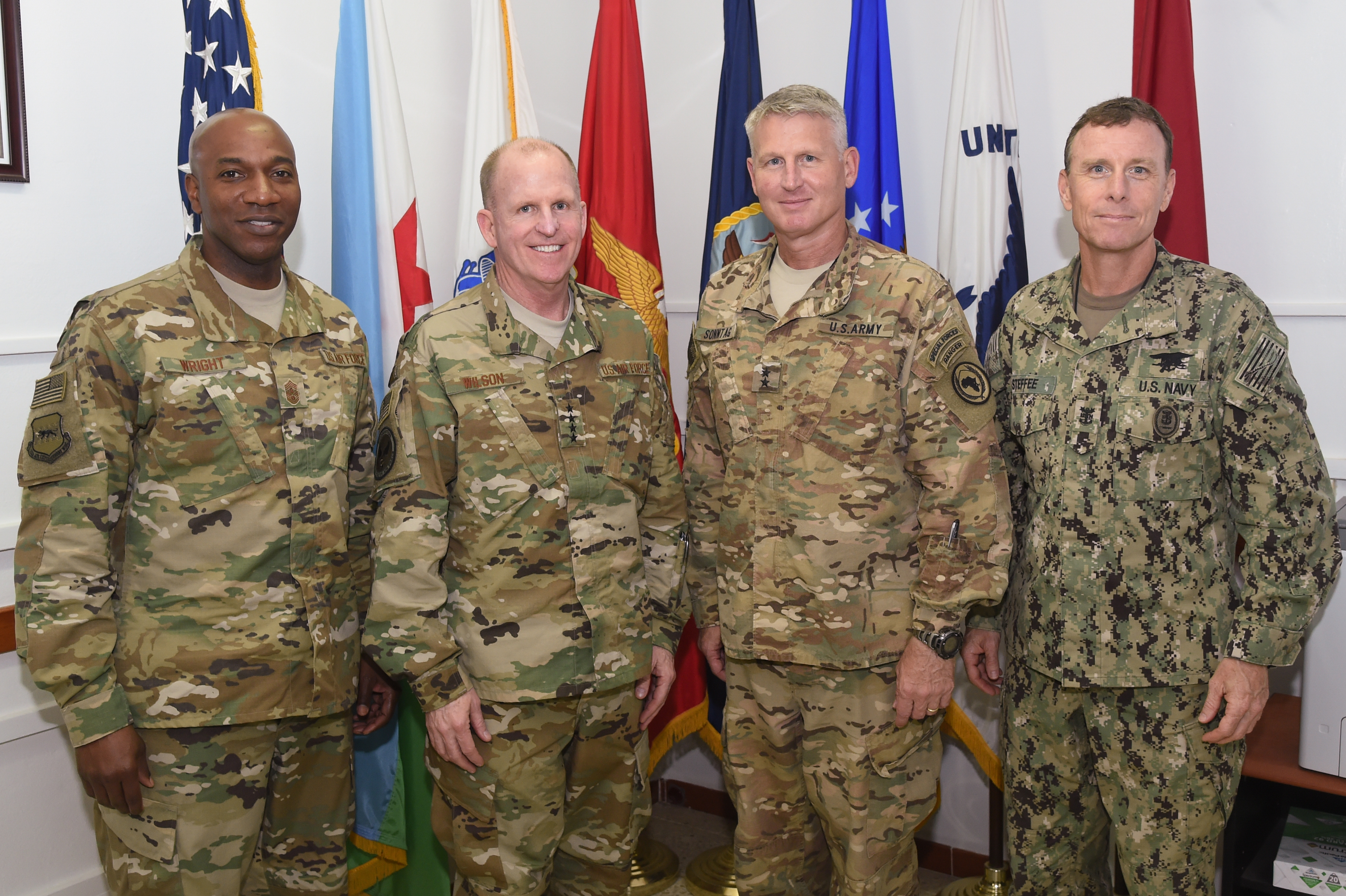 U.S. Air Force Chief Master Sgt. of the Air Force Kaleth Wright, U.S. Air Force Vice Chief of Staff Gen. Stephen Wilson, U.S. Army Maj. Gen. Kurt Sonntag, commanding general of Combined Joint Task Force-Horn of Africa (CJTF-HOA), and U.S. Navy Command Master Chief Geoffrey Steffee, senior enlisted leader for CJTF-HOA, pause for a photo during a visit to Camp Lemonnier, Djibouti, April 11, 2017. Wilson visited CJTF-HOA and other tenant commands with Wright to gain a better understanding of Air Force integration and missions in the U.S. Africa Command area of responsibility. (U.S. Air National Guard photo by Staff Sgt. Penny Snoozy)