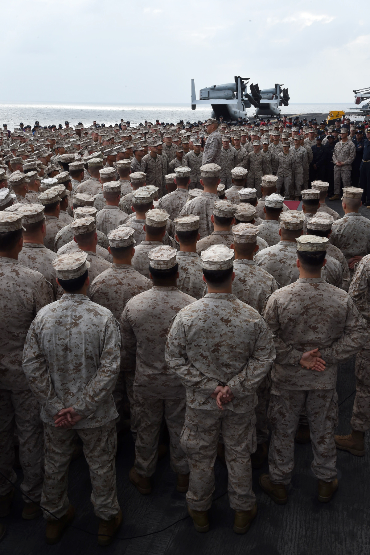 U.S. Marine Corps Gen. Robert B. Neller, 37th Commandant of the Marine Corps, speaks to Marines with the 11th Marine Expeditionary Unit and Sailors assigned to the amphibious assault ship USS Makin Island (LHD 8), in the Gulf of Aden, Dec. 23, 2016. A MEU is a forward-deployed, flexible sea-based Marine air-ground task force ready to respond to crisis and conduct limited contingency operations. (U.S. Air National Guard photo by Staff Sgt. Penny Snoozy)