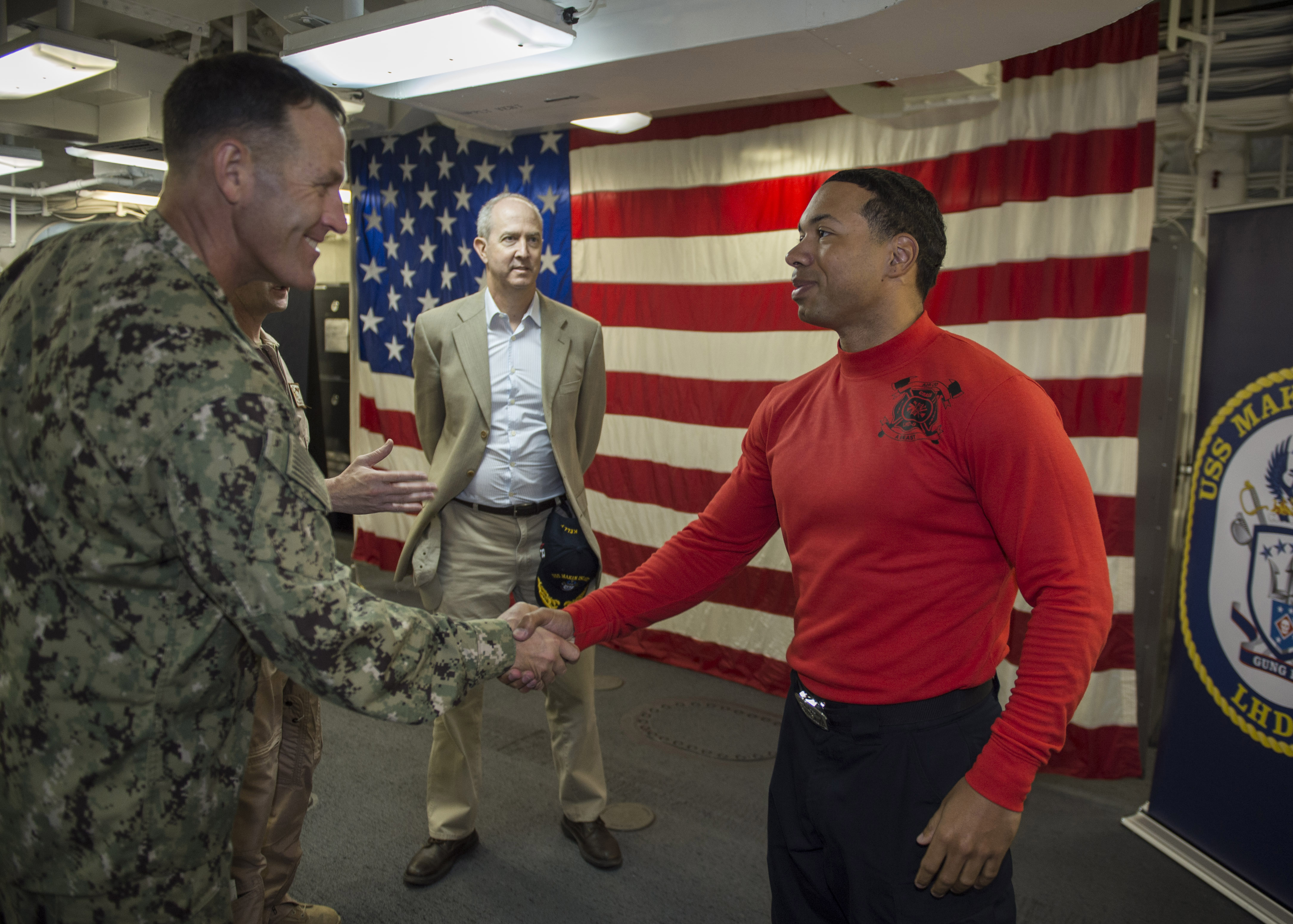 U.S. 5TH FLEET AREA OF OPERATIONS (Dec. 16, 2016) Rear Adm. William W. Wheeler, Deputy Commander, Combined Joint Task Force – Horn of Africa, greets USS Makin Island (LHD 8) Sailor of the Year, Petty Officer 1st Class Benjamin Odea, from Lansing, Mich., during a tour aboard the amphibious assault ship. Makin Island is deployed as part of the Makin Island Amphibious Ready group to the U.S. 5th Fleet area of operations to support maritime security operations and theater security cooperation efforts. (U.S. Navy photo by Petty Officer 3rd Class Devin M. Langer)