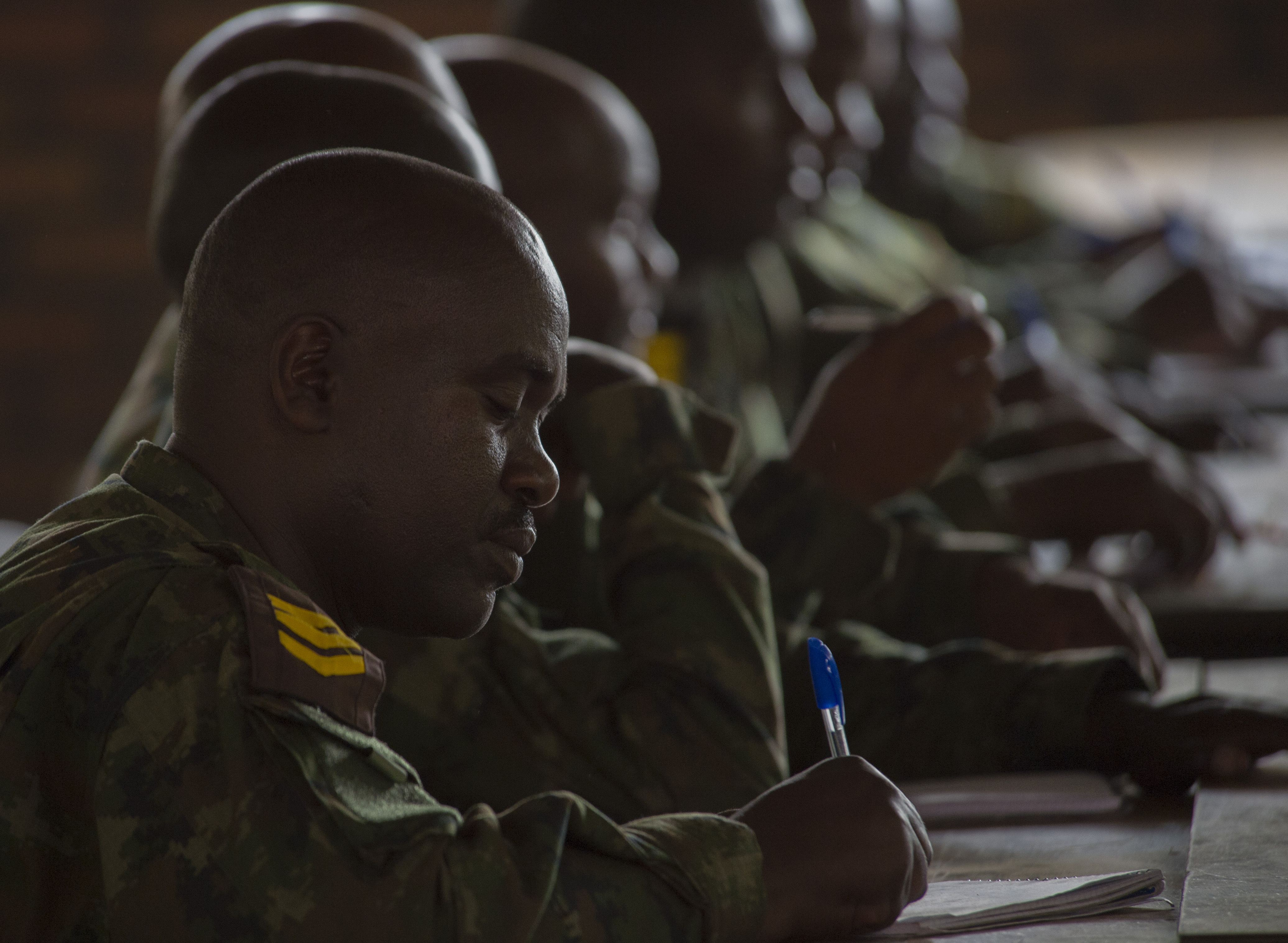 KENYA- Kenya Defense Forces combat engineer soldiers and officers complete a written test at the end of their second week of class during Deliberate Kindle 2016, Sept. 16, at a training center in Kenya. U.S. Navy Task Force Sparta explosive ordnance disposal technicians and a dive independent duty corpsman, assigned to Combined Joint Task Force-Horn of Africa, provided counter-improvised explosive device, tactical combat medical care, and train-the-trainer skills to approximately 53 KDF soldiers and officers in preparation the KDF’s deployment with the African Union Mission in Somalia. (U.S. Air Force photo by Staff Sgt. Tiffany DeNault)