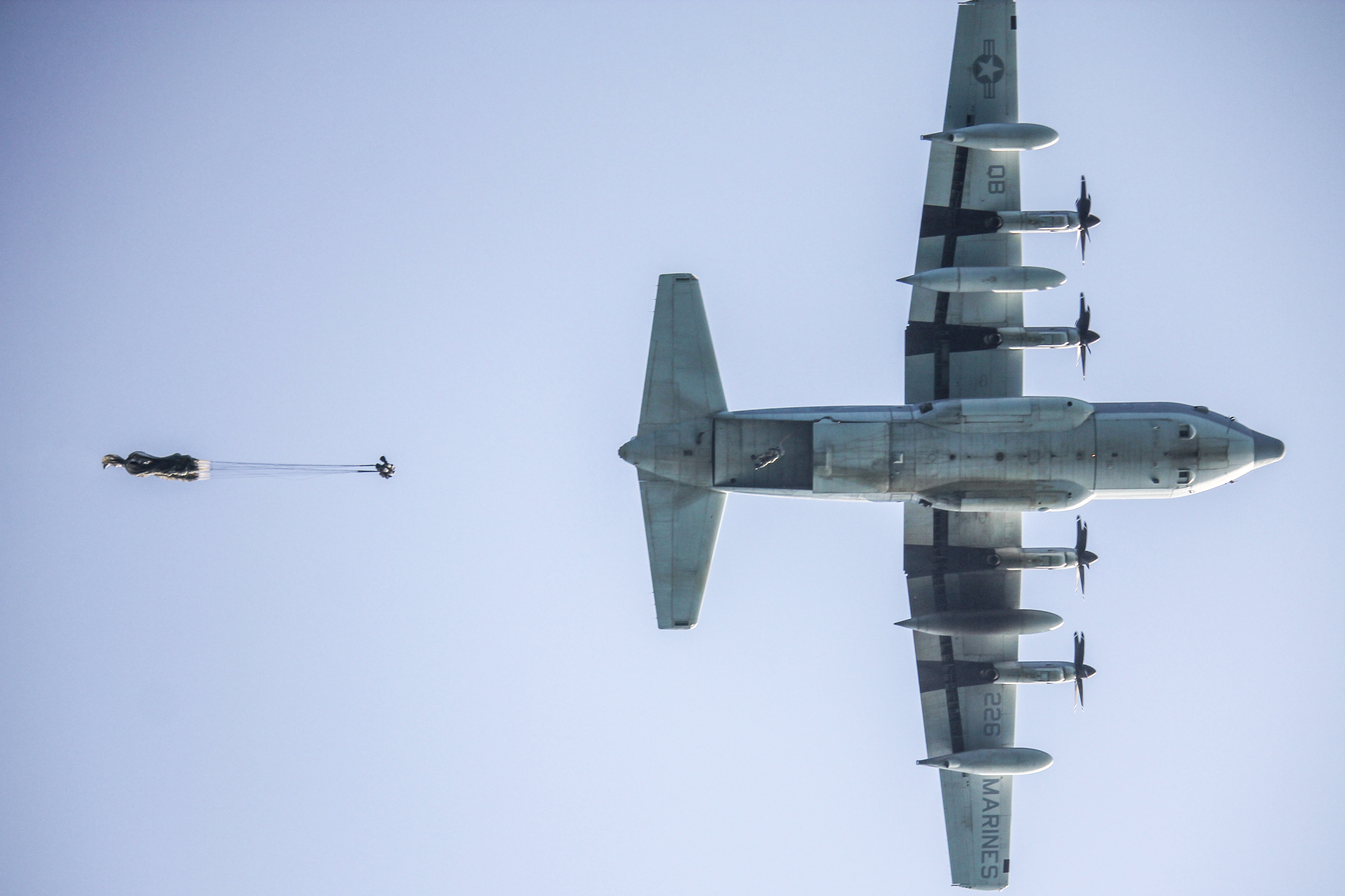 U.S. Air Force pararescuemen, assigned to the 82nd Expeditionary Rescue Squadron jump from of a KC-130J Super Hercules during Exercise Bull Shark over the Gulf of Aden near Djibouti, Dec. 3, 2021. Exercise Bull Shark was a combined training between U.S. and Spanish Forces to strengthen personnel recovery capabilities in support of the Warfighter Recovery Network initiative throughout Africa. (Photo by U.S. Air Force Tech. Sgt. Jeffrey Jordan)