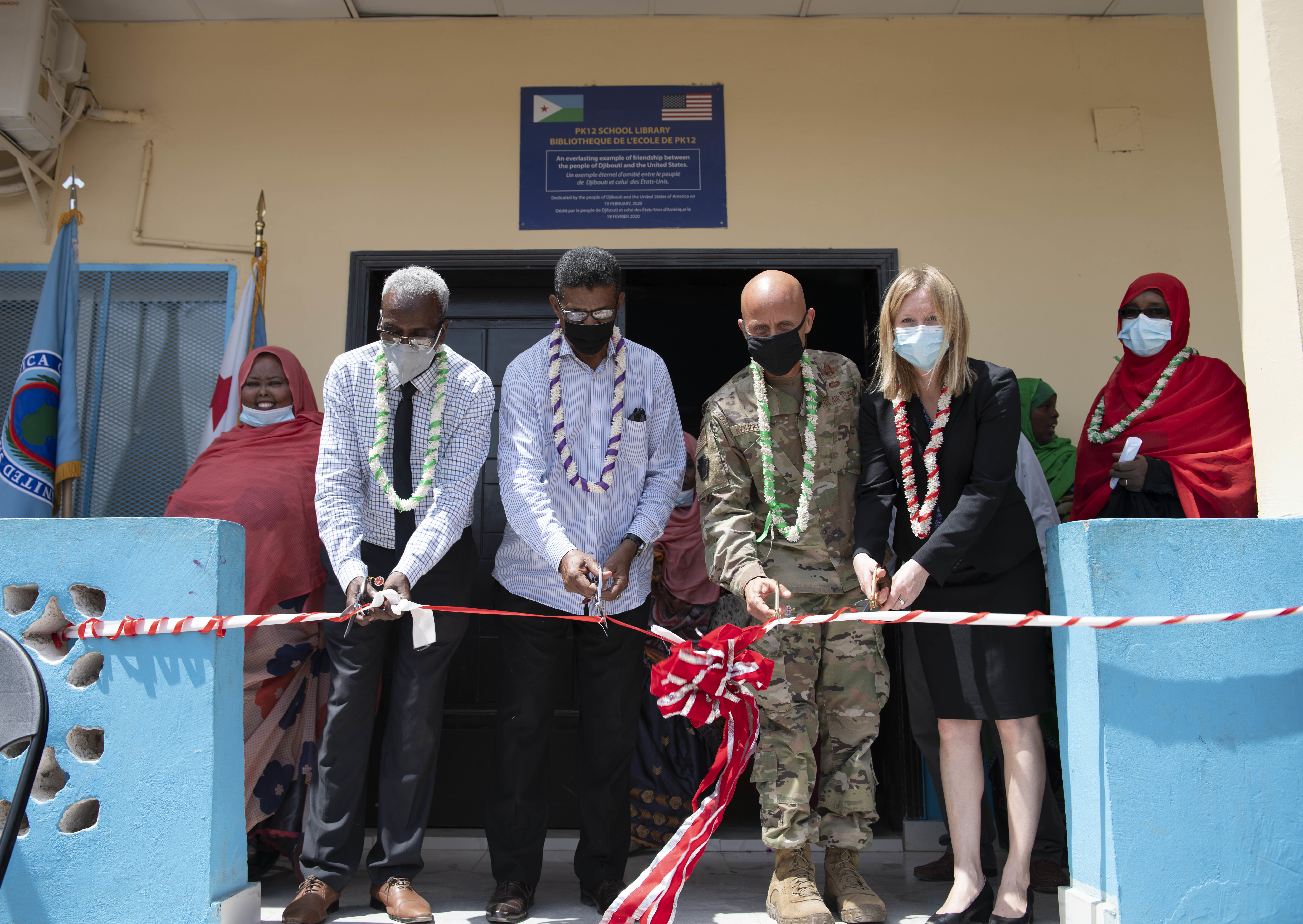 Abdi Dirir (left), head of general education, Adel (left center), an inspector with the PK-12 school, U.S. Air Force Brig. Gen. Terrence L. Koudelka (right center), Combined Joint Task Force - Horn of Africa (CJTF-HOA) deputy commanding general, and Liz Canellakis (right), public diplomacy officer for the U.S. Embassy in Djibouti, cut the ribbon during the inauguration ceremony of a library to the PK-12 school at Djibouti City, Djibouti, May 19, 2021. This project created local jobs and was built by a Djiboutian construction company employing Djiboutian laborers. (U.S. Air Force photo by Senior Airman Morgan L. Brown)