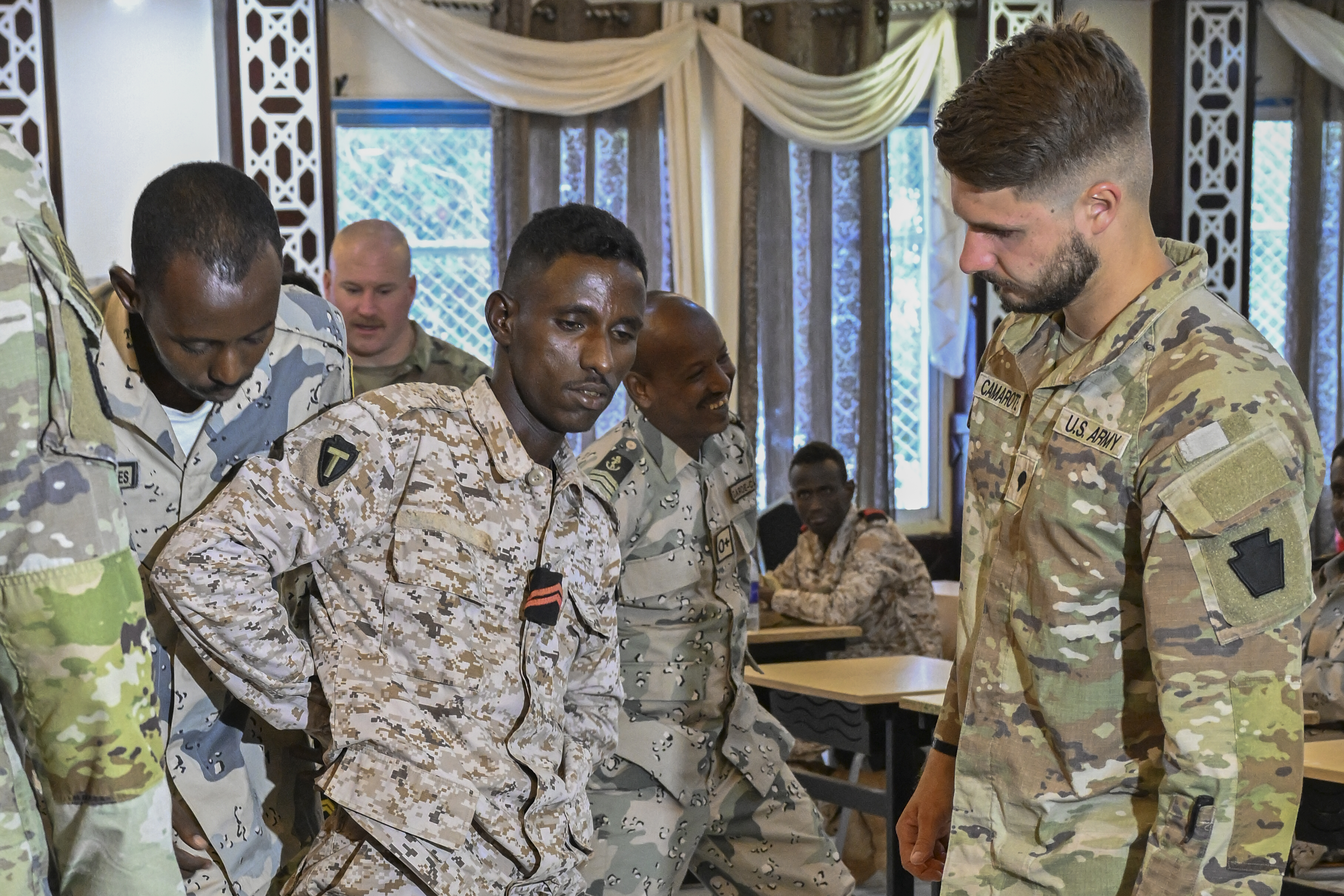 U.S. service members assigned to Combined Joint Task Force - Horn of Africa teach Djiboutian service members academics, leading up to exercise Bull Shark 25-2, while at Camp Doraleh, Djibouti, April 15, 2025. Knowledge exchanges between Combined Joint Task Force - Horn of Africa, Camp Lemonnier, and Djiboutian military forces ensure a common mastery level necessary to prepare for Bull Shark 25-2, a multinational, biannual exercise. (U.S. Air Force photo by Airman 1st Class Joseph Bartoszek)