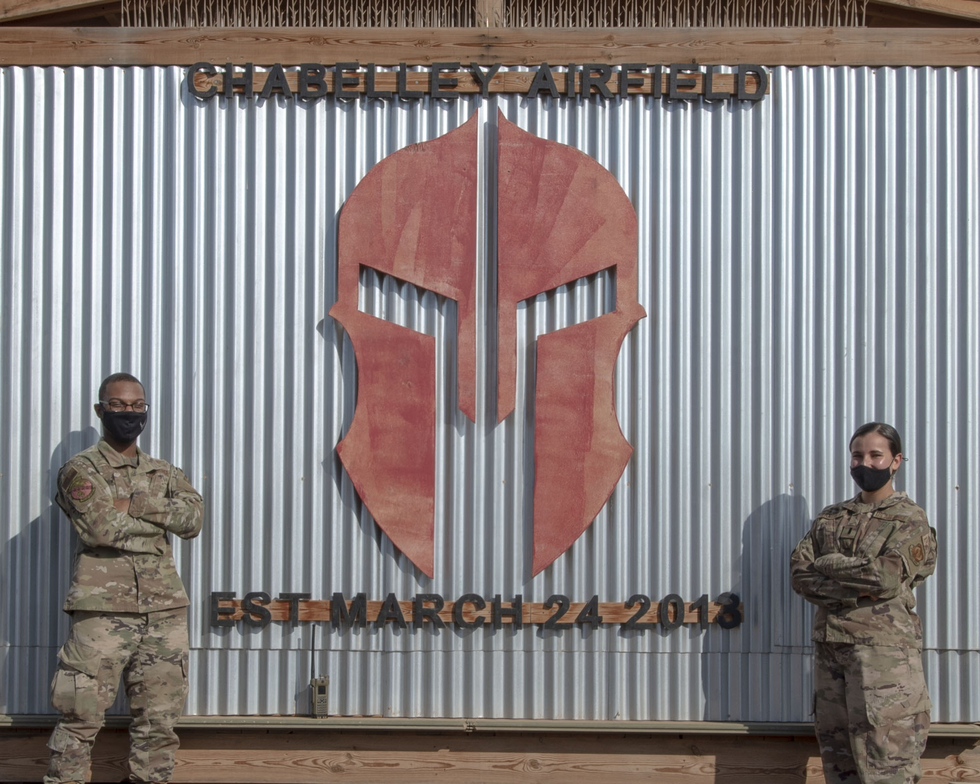 U.S. Air Force Staff Sgt. Darius Etheridge, operations management, 776th Expeditionary Air Base Squadron (EABS), and U.S. Air Force 1st Lt. LeighAnn D’Andrea, base civil engineer, 776th EABS, pose for a photo, Jan. 8, 2021, at Chabelley Airfeild, Djibouti. Despite the challenges being geographically separated from their supporting organizations have brought them, they have managed to get the mission done. (U.S. Air Force photo by Senior Airman Kristin Savage)