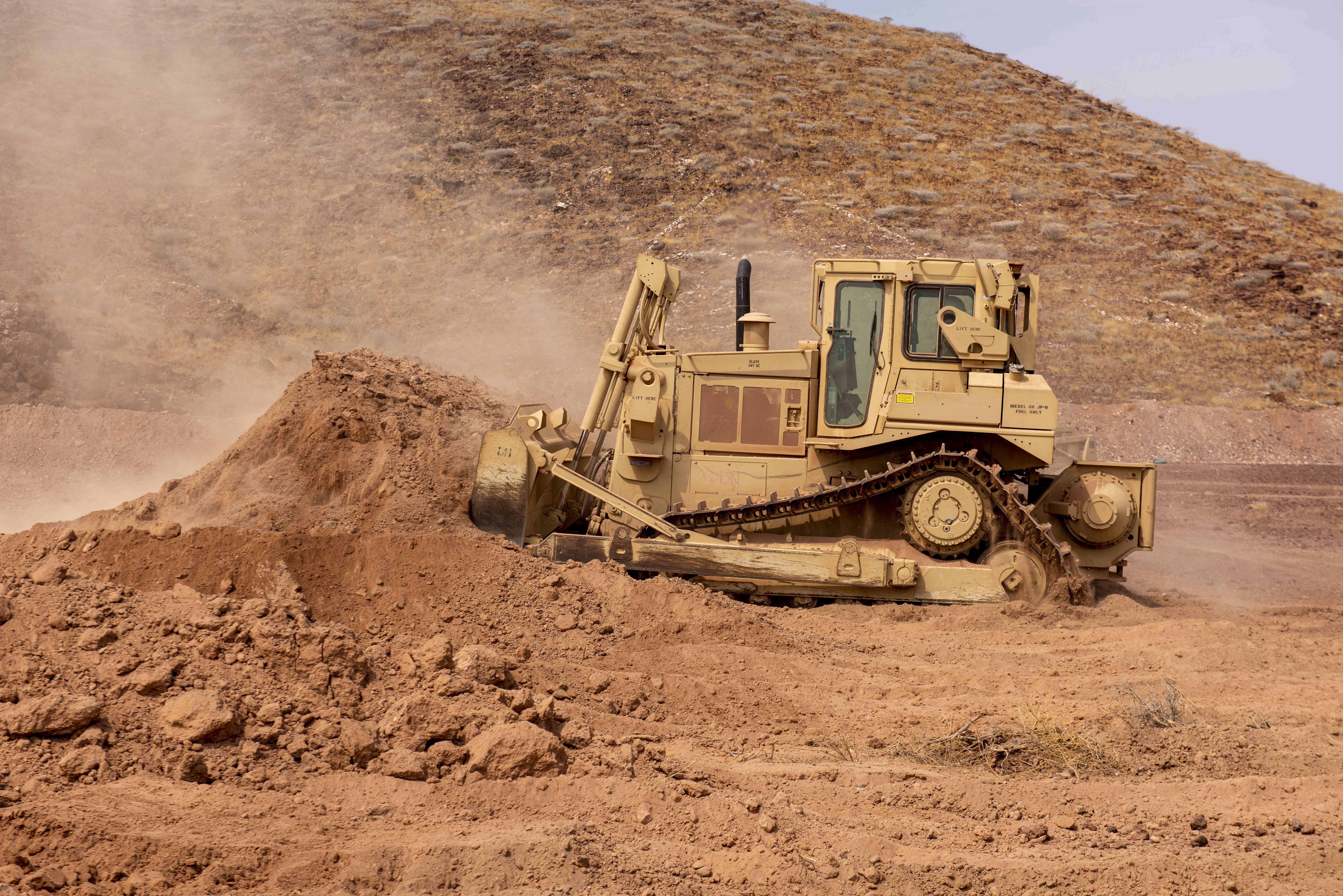 U.S. Army Spc. Thomas Brooks, heavy equipment operator, 760th Engineer Vertical Construction Company (EVCC), Combined Joint Task Force-Horn of Africa (CJTF-HOA), clears berms using a DOZER at a Djiboutian National Army Rapid Intervention Battalion (RIB) installation, near Ali Oune, Djibouti, Sep. 16, 2020. The 760th EVCC is assisting the Djiboutian National Army’s RIB with improving a training range. (U.S. Army photo by Sgt. Joshua Young)