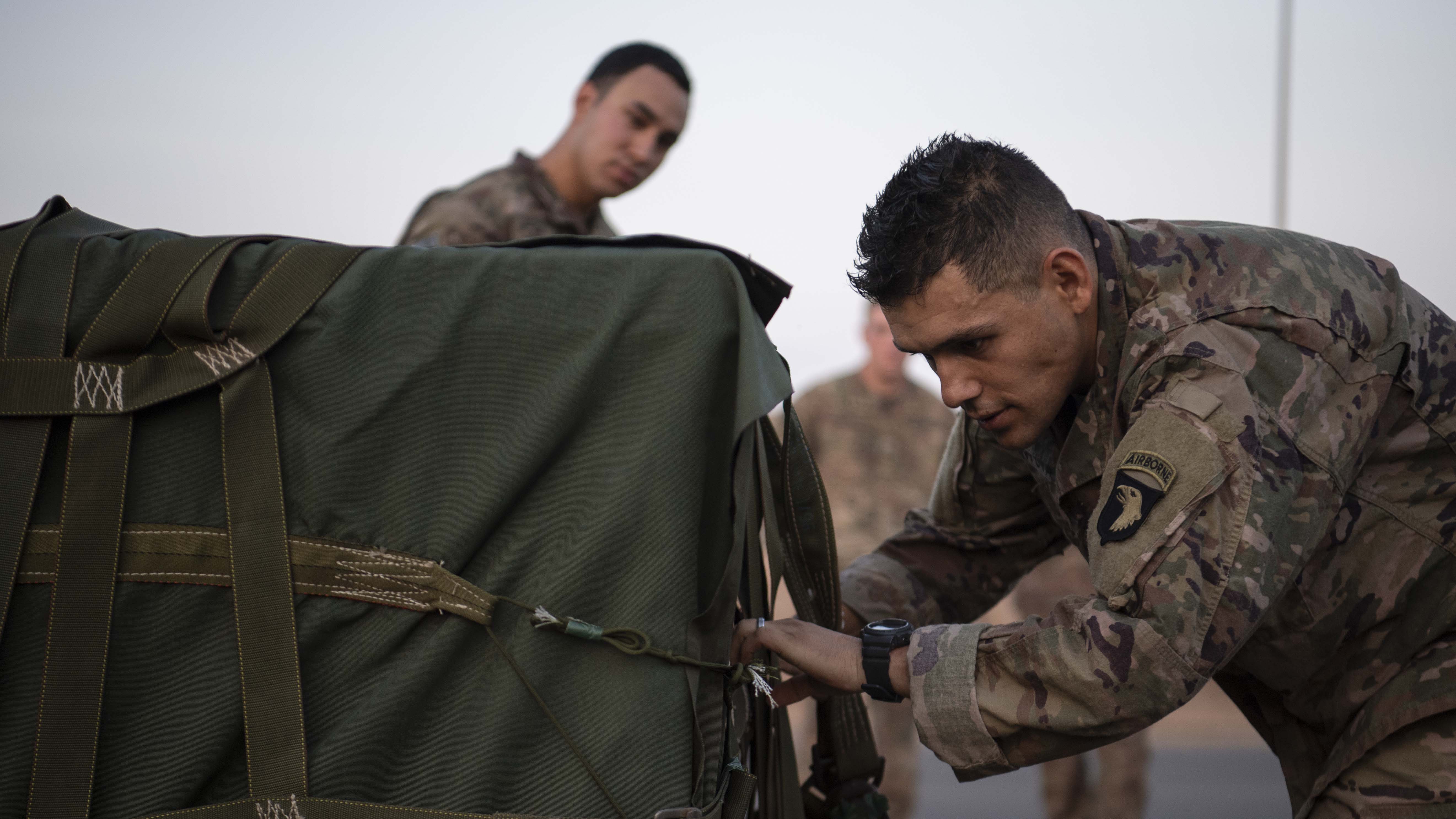 A U.S. Army Soldier from the 101st Division, 2nd Battalion, 506th Infantry Regiment, East African Response Force (EARF), inspects cargo for discrepancies during the EARF’s best platoon competition at Camp Lemonnier, Djibouti, Oct. 25, 2019. During the competition Soldiers completed a two-mile run, 25 meters of lunges, burpee long jumps and high crawls before finishing with 10 eight-count push-ups. (U.S. Air Force photo by Staff Sgt. J.D. Strong II)
