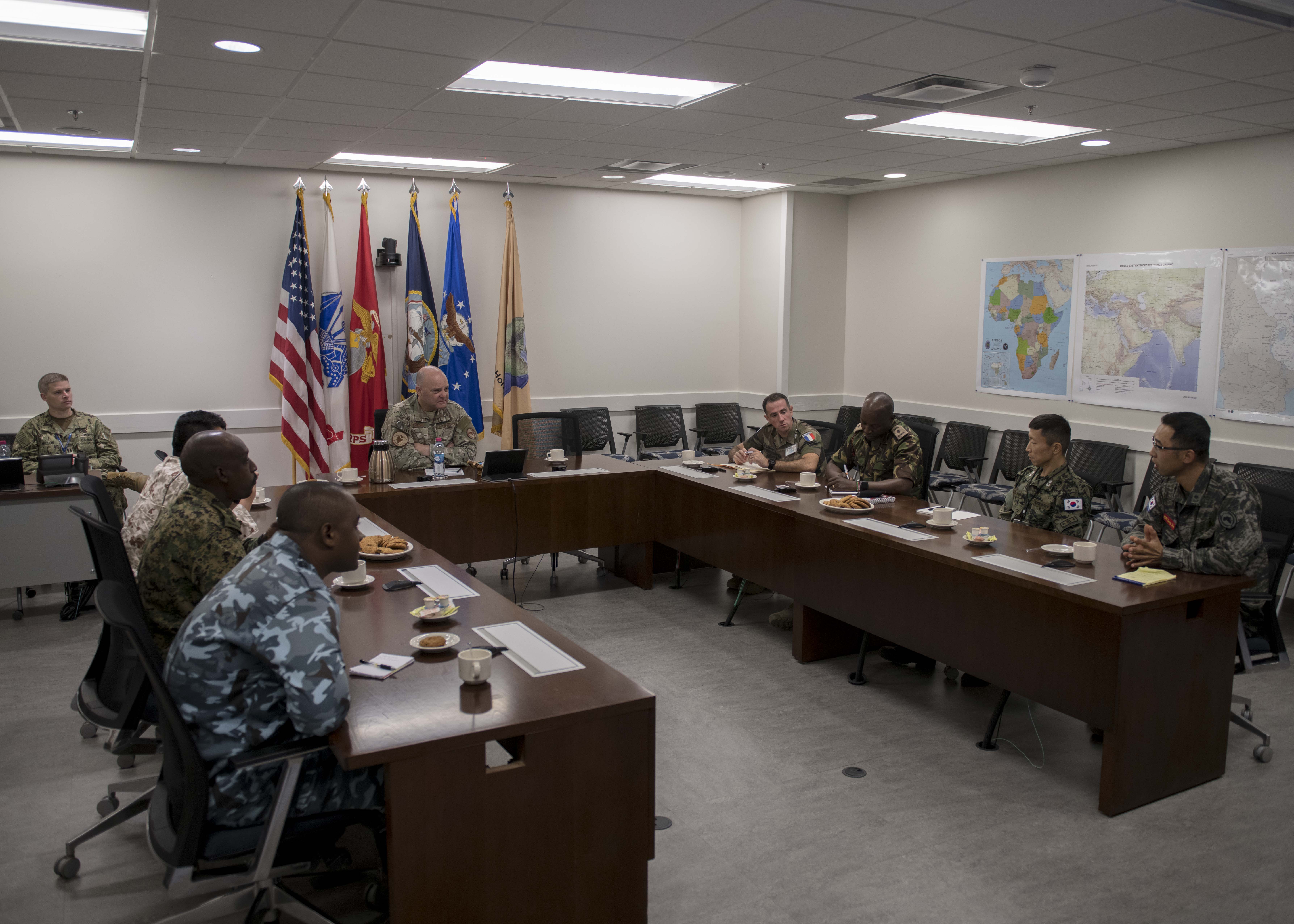 U.S. Air Force Brig. Gen. James R. Kriesel, deputy commanding general of Combined Joint Task Force - Horn of Africa (CJTF-HOA), meets with coalition foreign liaison officers (FLOs) assigned to CJTF-HOA. The FLOs act as first line communicators between CJTF-HOA and their country. (U.S. Air Force Photo by Senior Airman Codie Trimble)