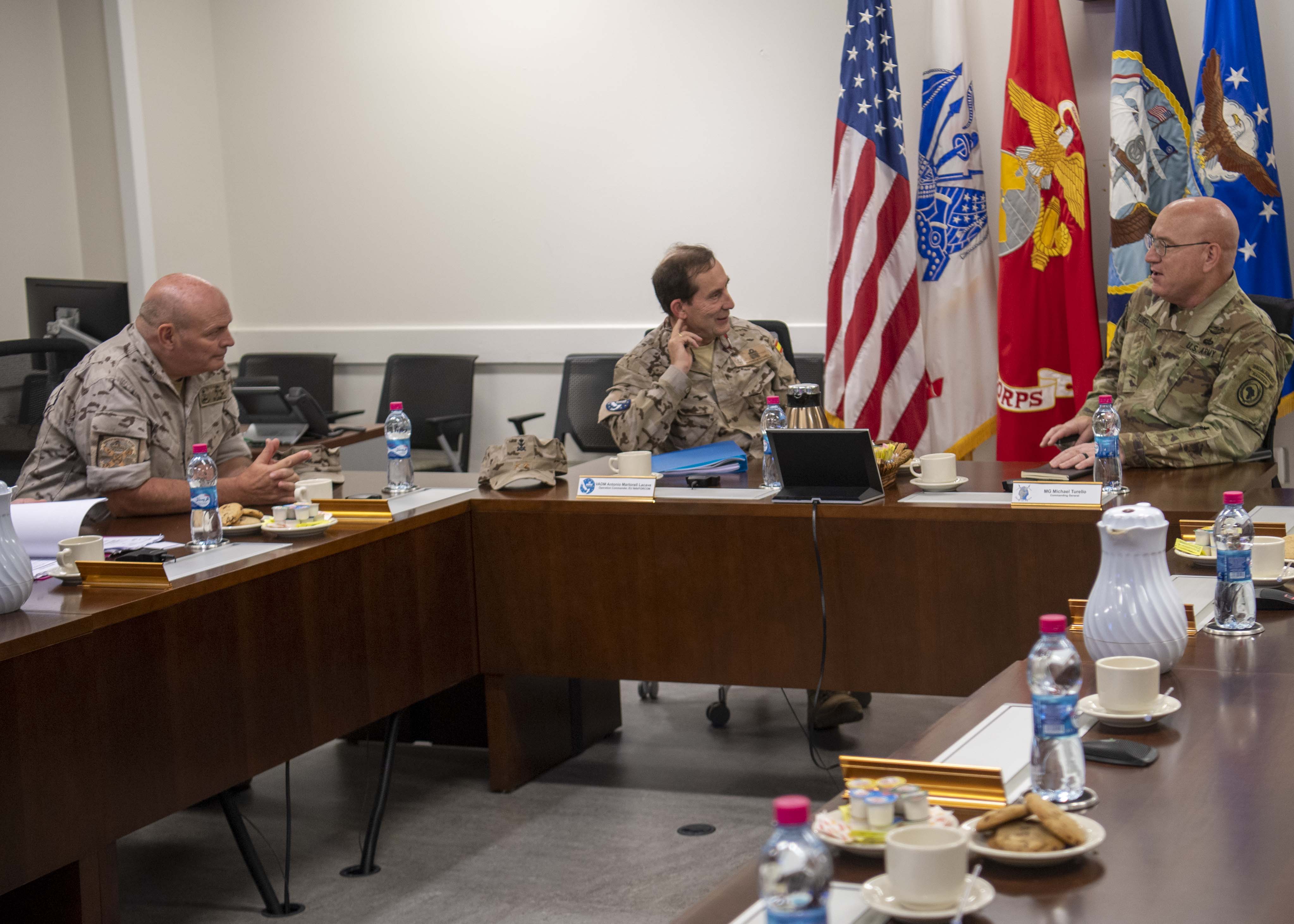 U.S. Army Maj. Gen. Michael Turello, commanding general, Combined Joint Task Force-Horn of Africa (CJTF-HOA), center, poses for a photo with Spanish Vice Adm. Antonio Lacave, operation commander, European Union Naval Force Somalia-Operation Atalanta, center left, and Spanish Maj. Gen. Antonio Palau, commandant general, Spanish Marine Corps, center right, at Camp Lemonnier, Djibouti, Sept. 21, 2019. Lacave and Palau visited CJTF-HOA to discuss the Atalanta mission and strengthen the partnership between CJTF-HOA and Operation Atalanta. (U.S. Air Force photo by Staff Sgt. J.D. Strong II)