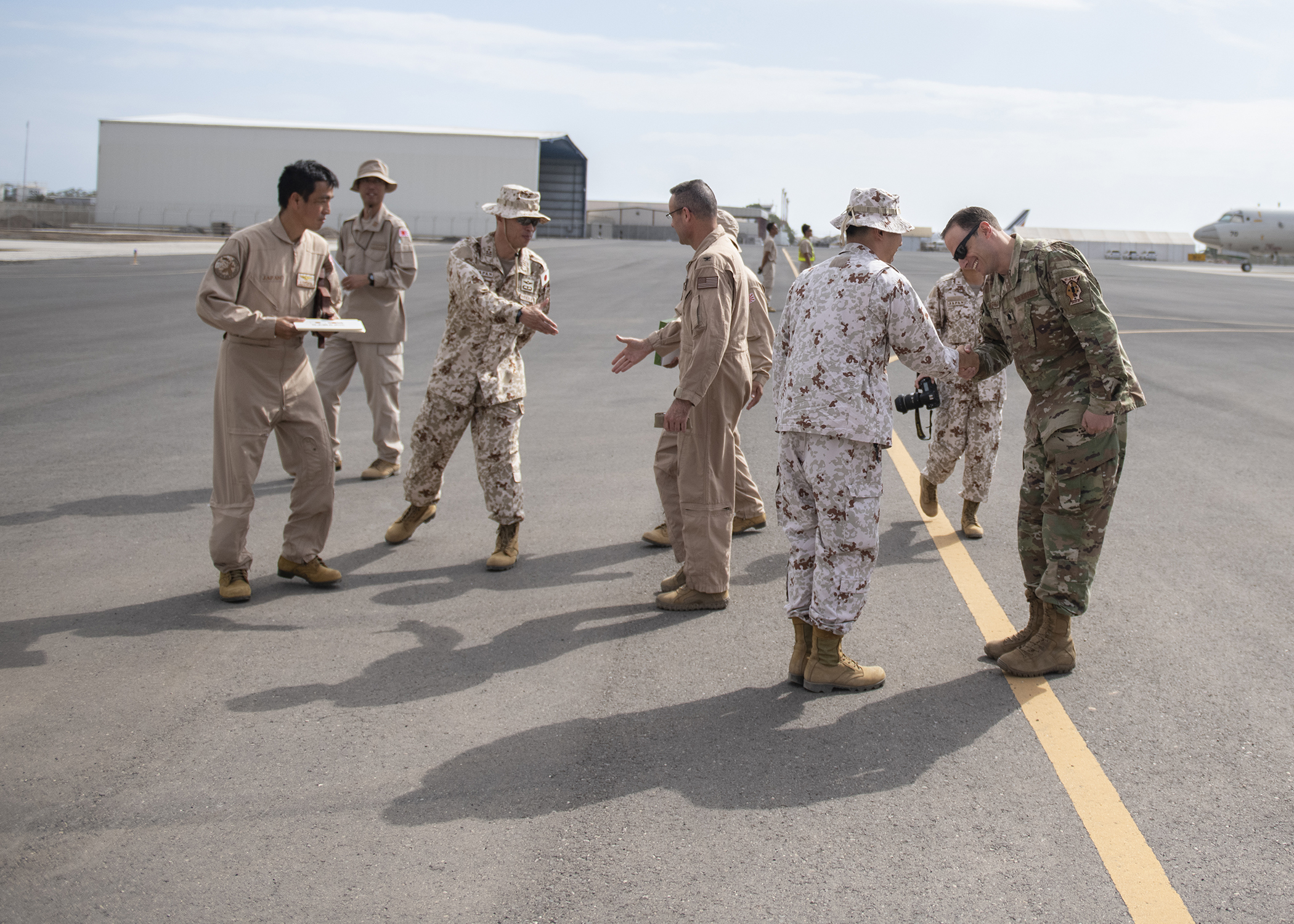 Japan Maritime Self-Defense Force (JMSDF) members assigned to Deployment Air Force for Counter-Piracy Operations, Djibouti, bid farewell to Combined Joint Task Force-Horn of Africa leadership prior to a P-3C Orion familiarization flight Jan. 19, 2019 in Djibouti, Djibouti. Leadership from CJTF-HOA took the flight to gain a better perspective of the JMSDF mission. (U.S. Air Force photo by Tech. Sgt. Shawn Nickel)
