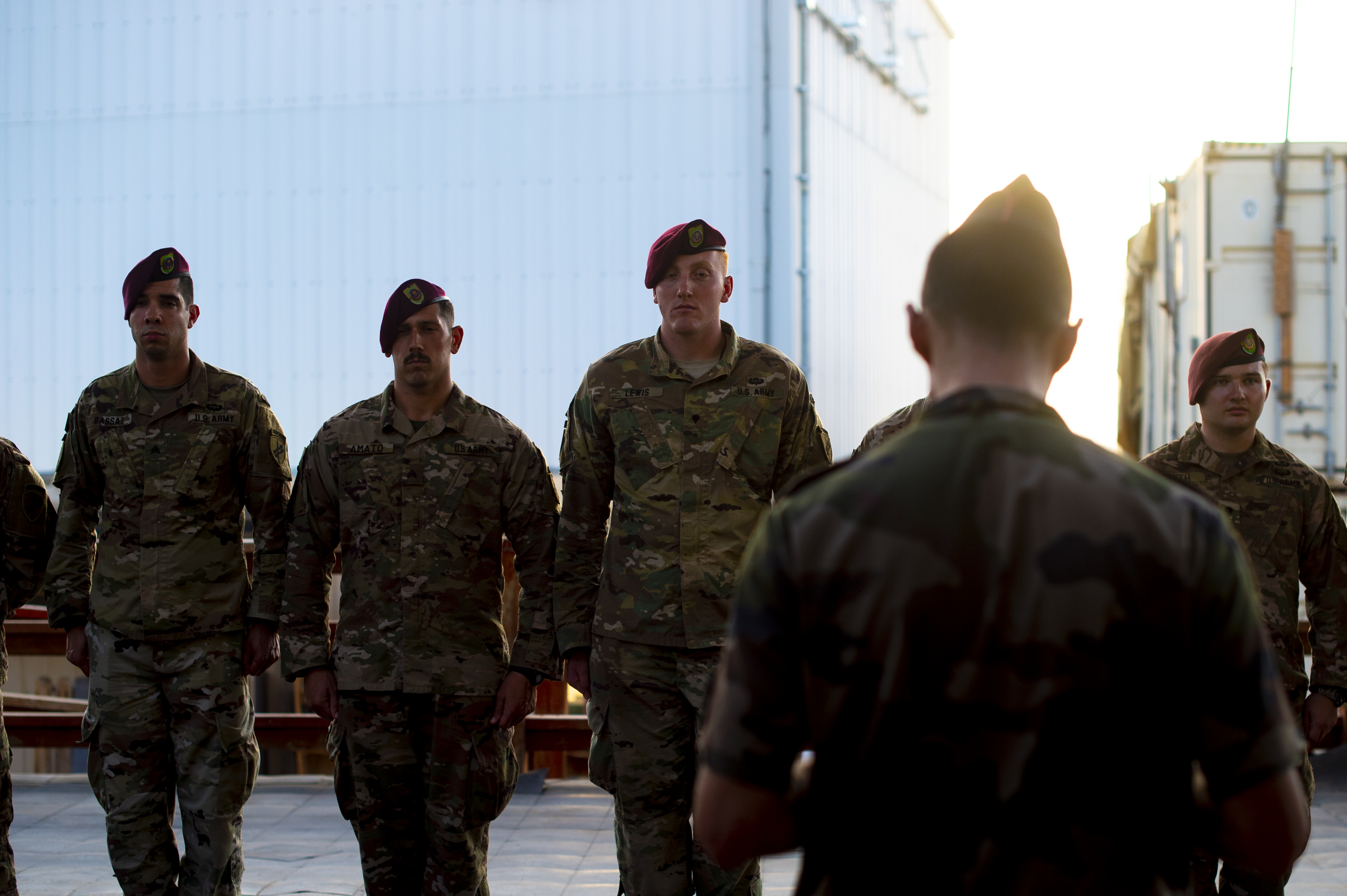 From Left: U.S. Air Force Tech. Sgt. Adam Murphy, a survival, evasion, resistance and escape specialist assigned to Combined Joint Task Force-Horn of Africa, teaches U.S. Army Pfc. Jonathan Galindo, a field artillery firefinder radar operator, Sgt. 1st Class Amando Vidal, a field artillery firefinder radar operator, and Spec. Killian Tooke, a radar repairer, all assigned to 3rd Battalion, 133rd Field Artillery Regiment, Texas National Guard, how to create a slipknot, bowline and a trucker’s hitch during survival skills training on Camp Lemonnier, Djibouti, Oct. 13, 2018. During this training, service members performed various skills such as constructing a shelter, finding alternative water sources and signaling for rescue. (U.S. Air National Guard photo by Master Sgt. Sarah Mattison)