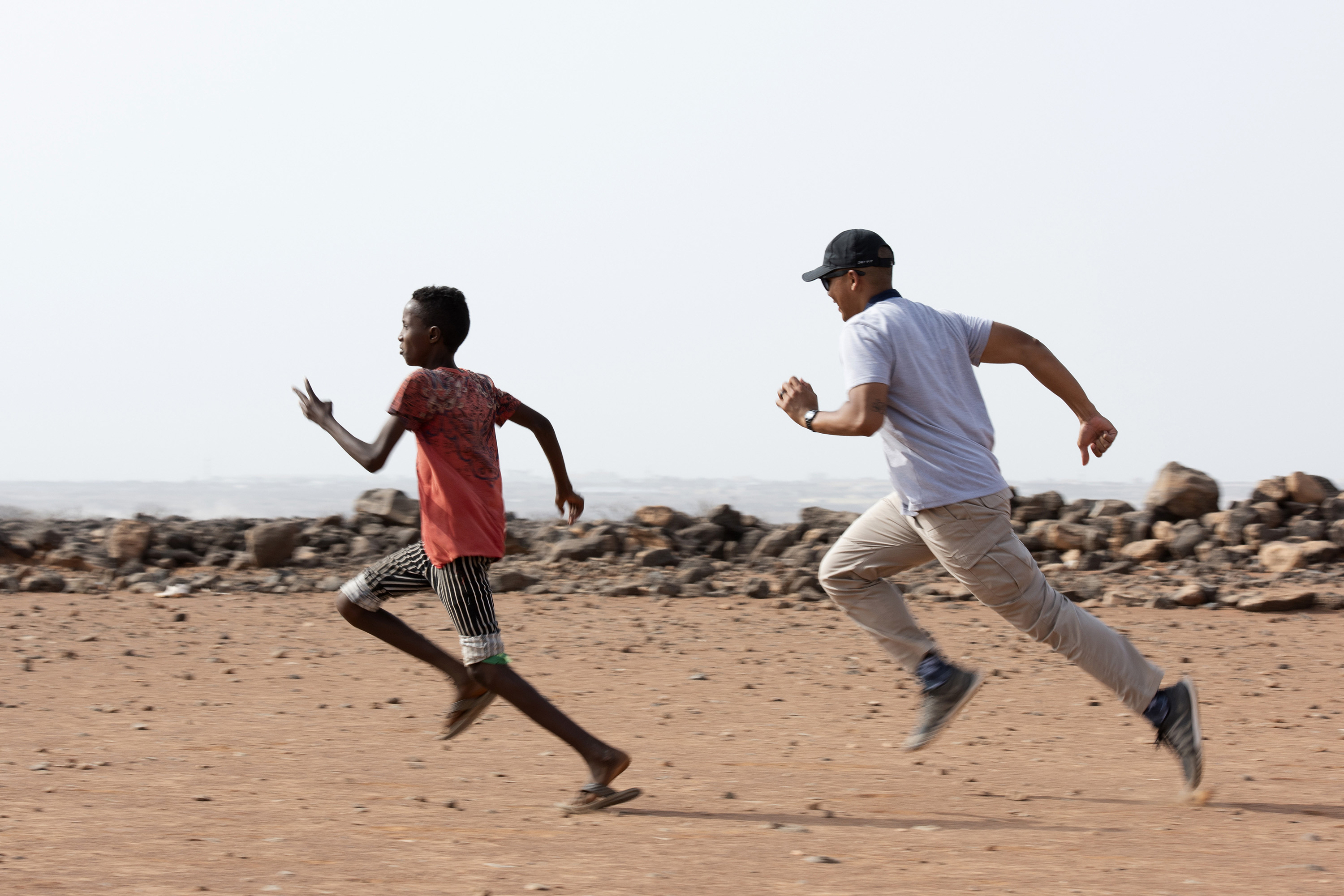 U.S. Air Force 1st Lt. Darren Domingo, officer in charge, Combat Camera, assigned to Combined Joint Task Force - Horn of Africa, races with a child from the local village outside of Chebelley Village, Djibouti, Aug. 3, 2018. Domingo was one of 30 service members participating in an outreach event organized by the 404th Civil Affairs Battalion. (U.S. Air National Guard photo by Master Sgt. Sarah Mattison)