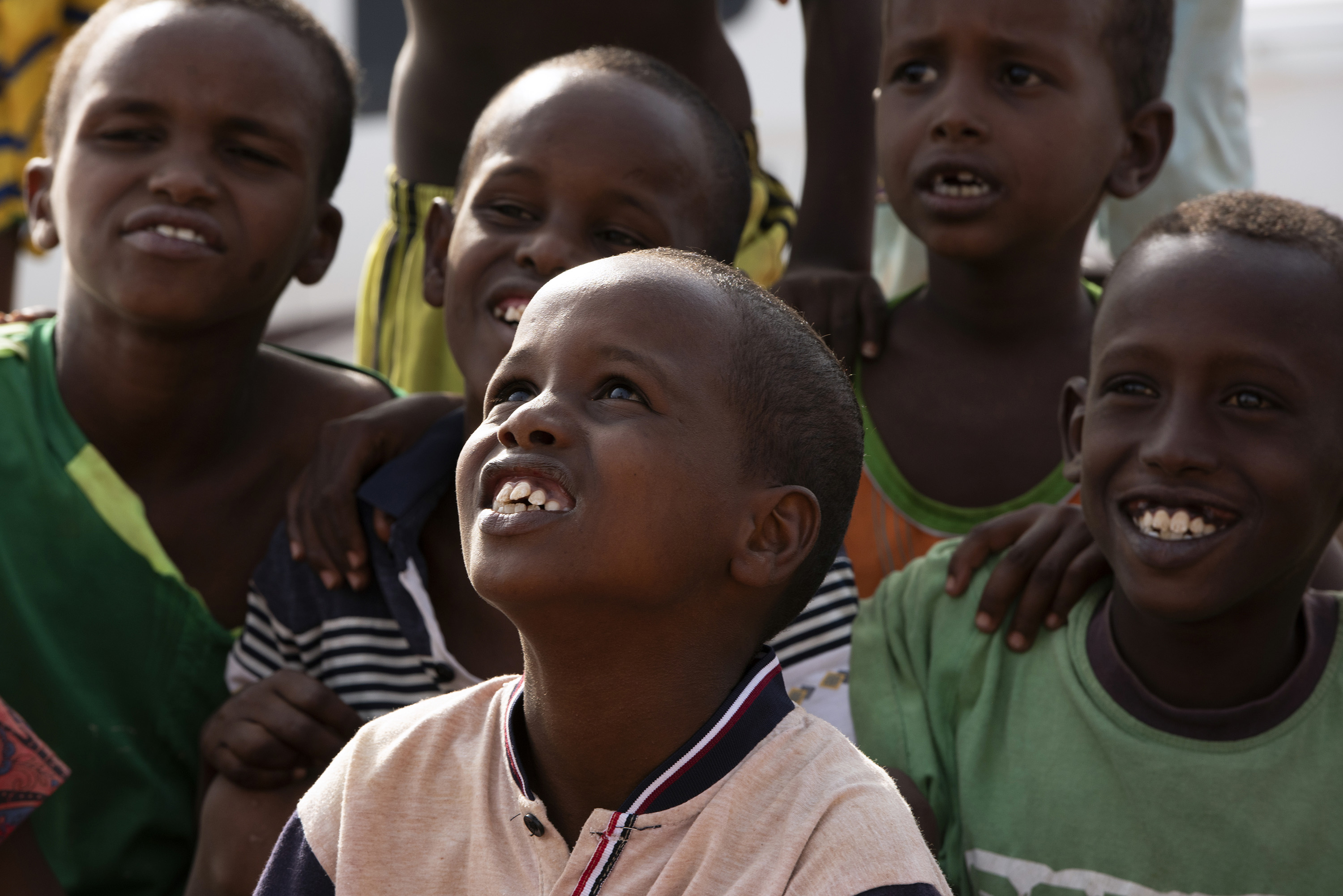 Djiboutian children from Chebelley Village gather before playing soccer outside of Chebelley Village, Djibouti, Aug. 3, 2018. The 404th Civil Affairs Battalion organized an outreach event that included 30 service members from Combined Joint Task Force - Horn of Africa. (U.S. Air National Guard photo by Master Sgt. Sarah Mattison)