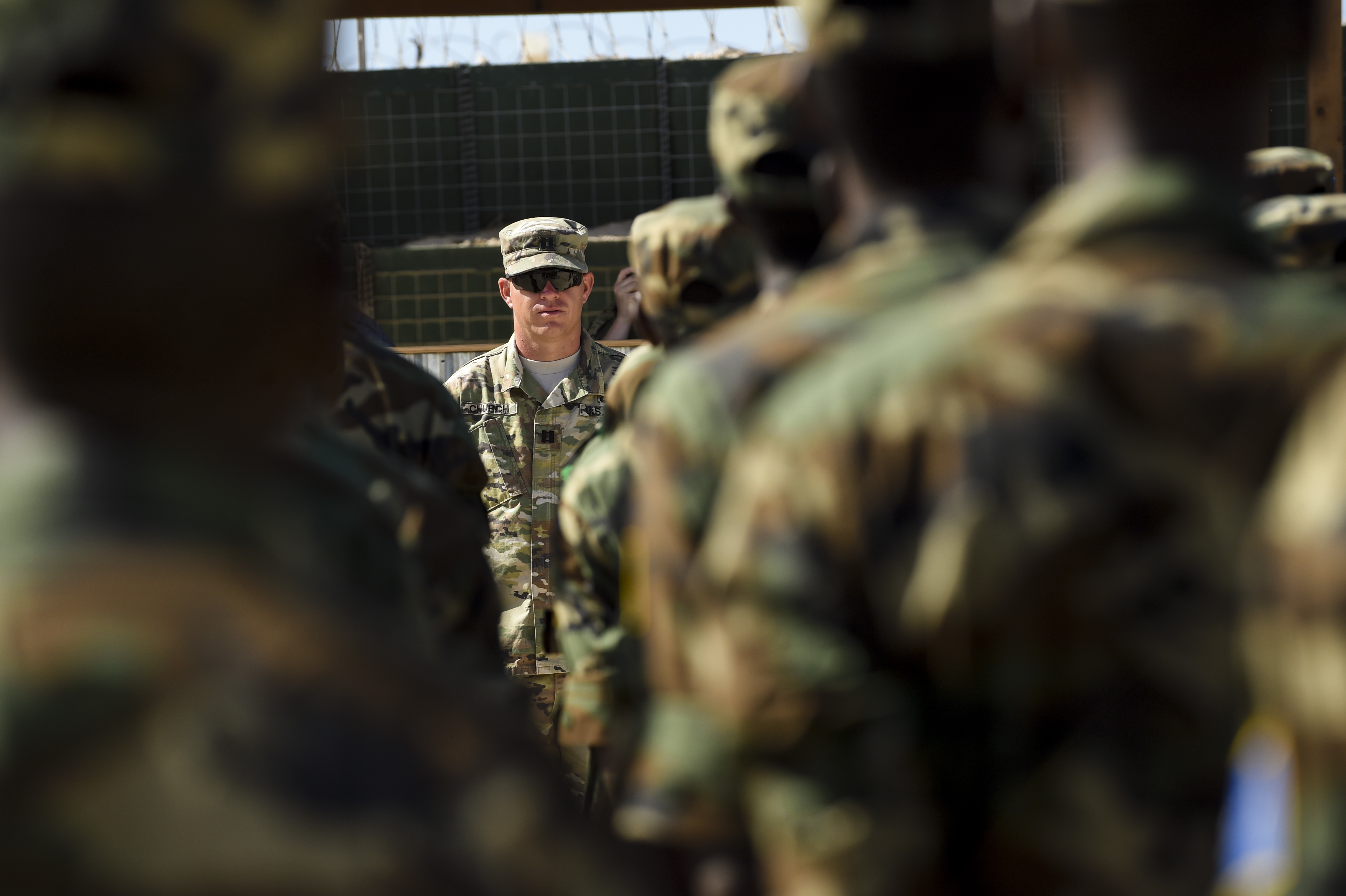 U.S. Army Capt. Seth Church with the 101st Airborne Division stands in front of a military formations of Somali National Army soldiers during a graduation ceremony May 24, 2017, in Mogadishu, Somalia. Church was one of five trainers the U.S. sent at the request of the Federal Government of Somalia to train its soldiers on logistics. (U.S. Air Force photo by Staff Sgt. Nicholas M. Byers)