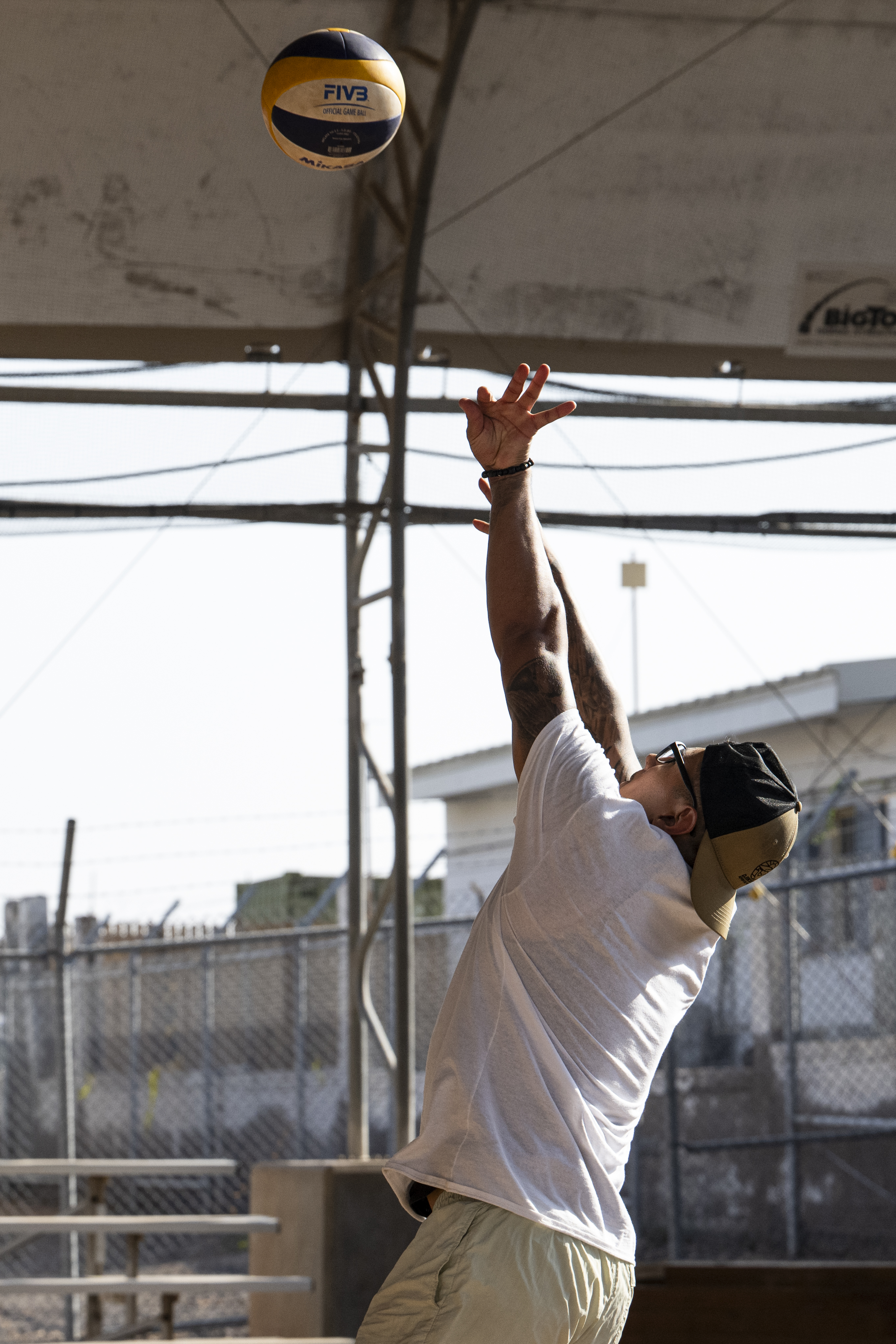 U.S. Army Staff Sgt. Ricardo Ortiz, Combined Joint Task Force - Horn of Africa CJ-3 admin NCO, sets the ball during a pick-up volleyball game at Camp Lemonnier, Djibouti, Feb. 9, 2025. Ortiz was highlighted in CJTF-HOA’s Human of HOA feature and shared his story about leadership through volleyball. “Volleyball is a big stress reliever, especially on deployments…you need to surround yourself with positive individuals.” (U.S. Air Force photo by Airman 1st Class Joseph Bartoszek)