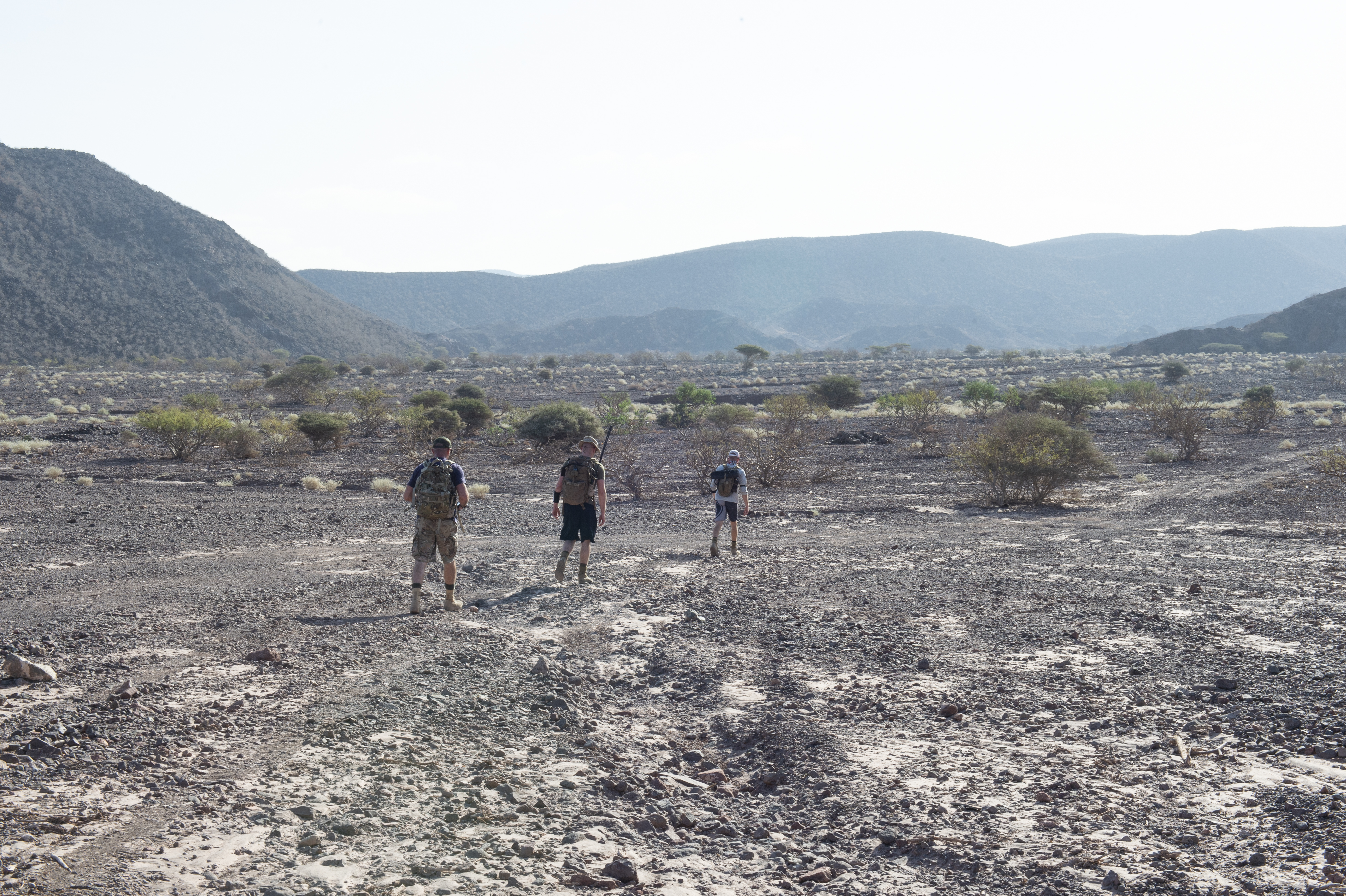Tactical communication experts assigned to Combined Joint Task Force-Horn of Africa hike through a dry river bed on the way to a distant peak to test radio equipment during an exercise at the Arta Range Complex Jan. 18, 2019. The joint teams of Soldiers, Sailors and Marines utilized the exercise to test all forms of radio equipment they could be tasked to use in case of a last-minute forward deployment. (U.S. Air Force photo by Tech. Sgt. Shawn Nickel)