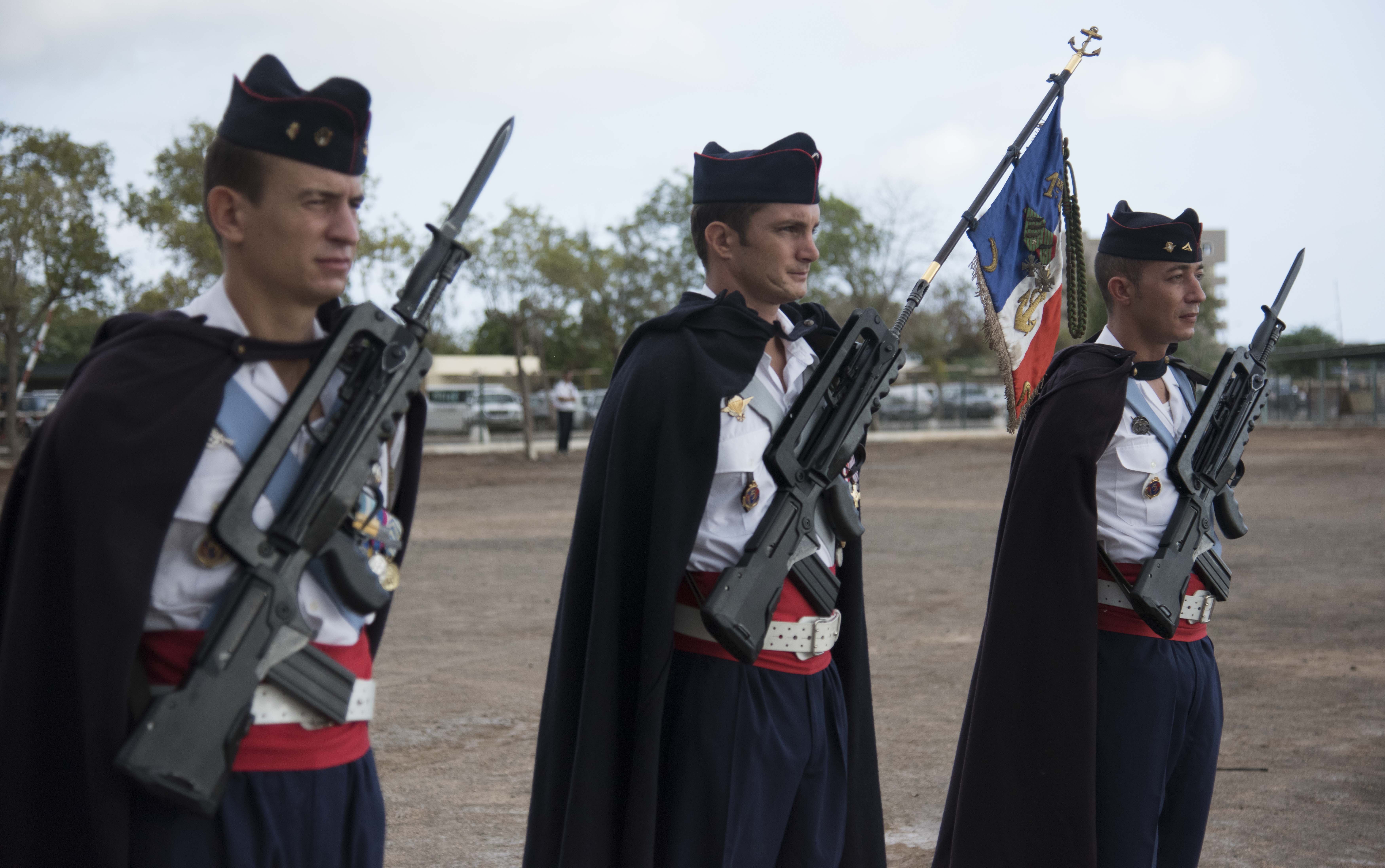 French troops stand guard over the flag of the French Somali Battalion during the Armistice Day ceremony at the French Marine Base, Nov. 11, 2015. Troops from the Horn of Africa and Yemen carried the flag through both world wars.