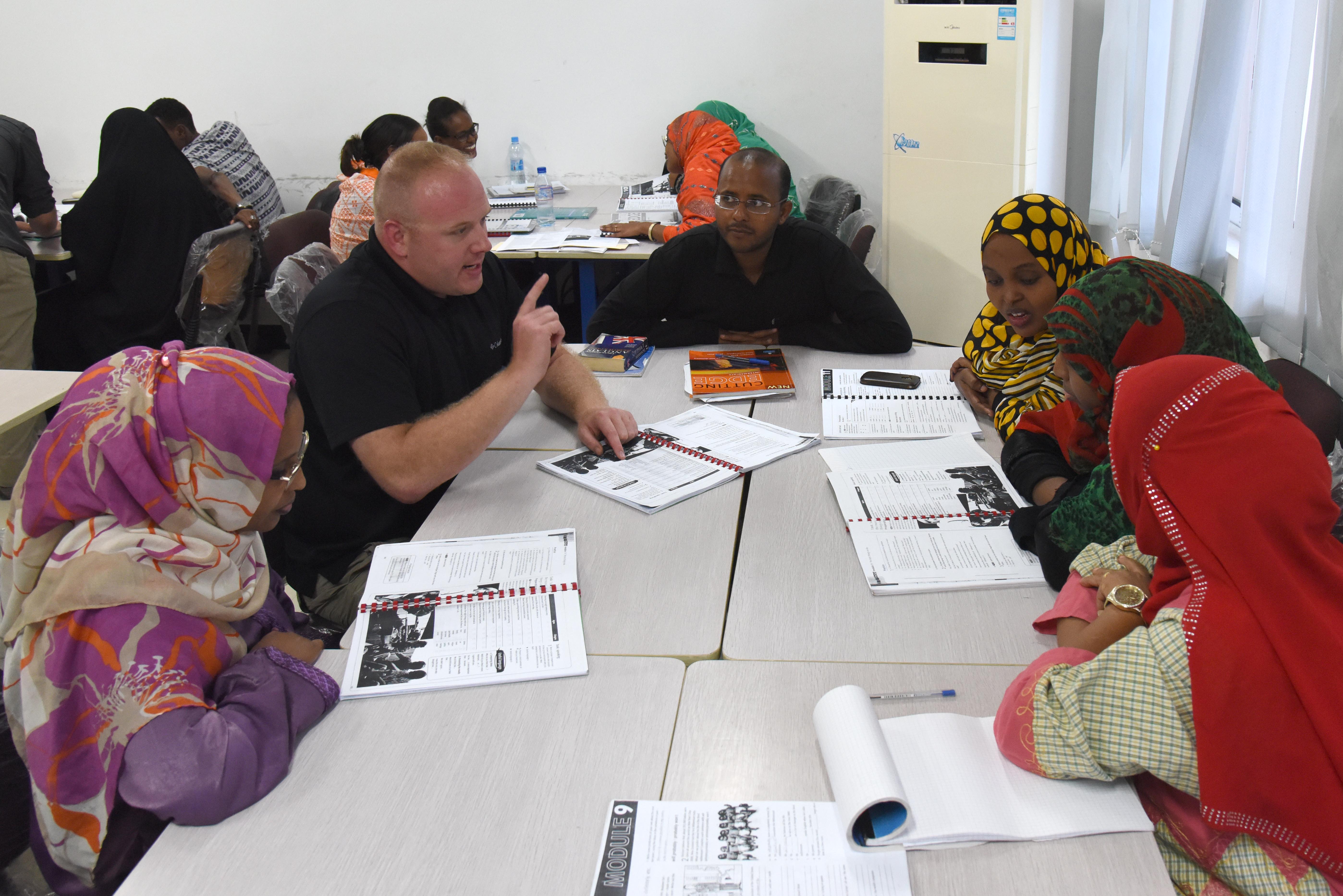 U.S. Army Maj. William Jones, 403rd Civil Affairs Battalion team chief, clarifies a phrase for Djiboutian students during an English discussion group at the Diplomatic Institute in Djibouti, Jan. 12, 2016. The English discussion groups not only help students practice their newly acquired language skills with native speakers, but they also acquaint them with U.S. military members on a personal level. (U.S. Air Force photo by Staff Sgt. Victoria Sneed)