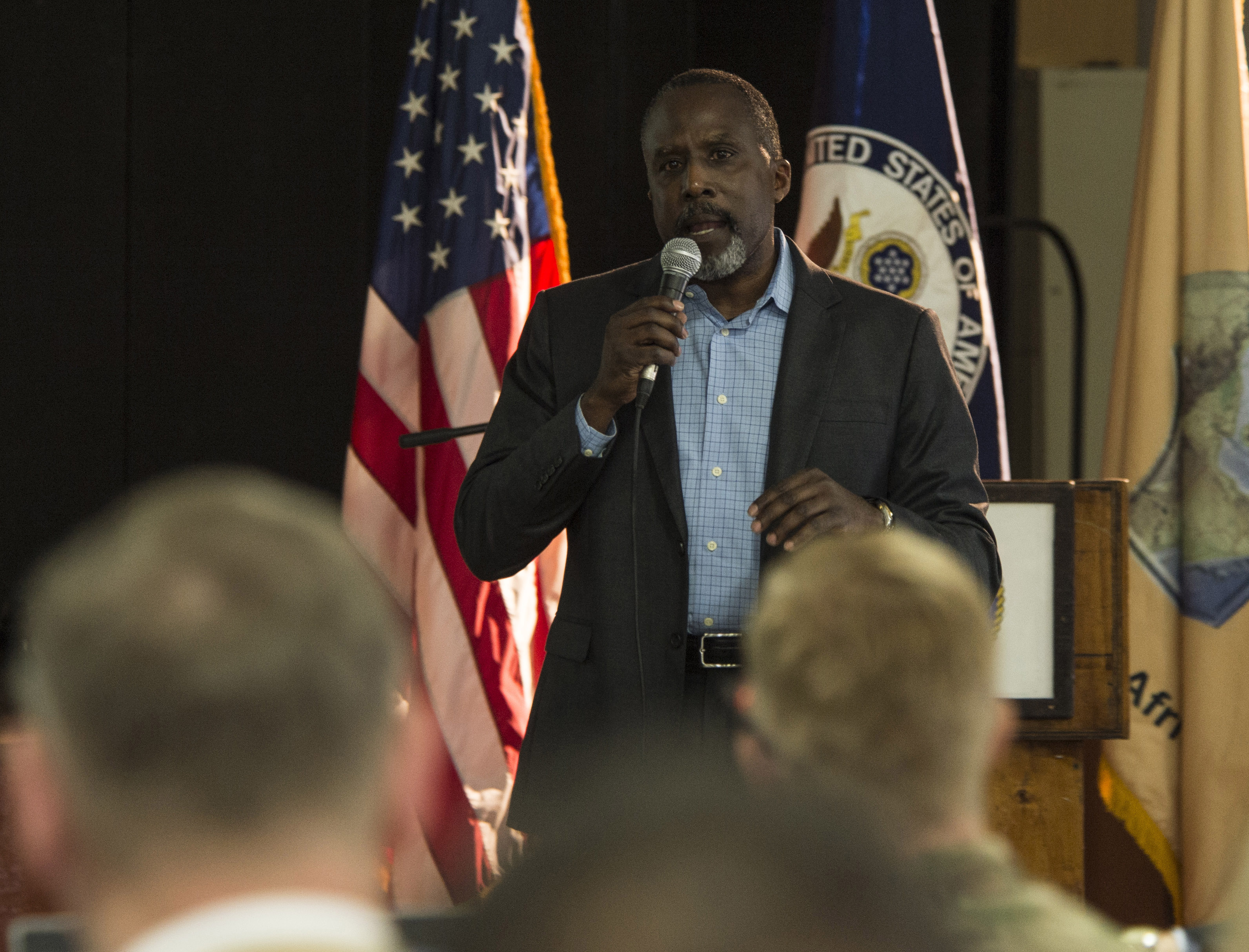Victor John, Africa Contingency Operations Training and Assistance program operations manager, speaks to audience members during the East Africa Security Synchronization Conference Jan. 20, 2016, at Camp Lemonnier, Djibouti. More than 70 U.S. embassy representatives from each East African country and organizations including the African Union, U.S. Africa Command, and AFRICOM components attended the event to kick start the process of synchronizing and prioritizing all activities in East Africa. (U.S. Air Force photo by Senior Airman Peter Thompson)