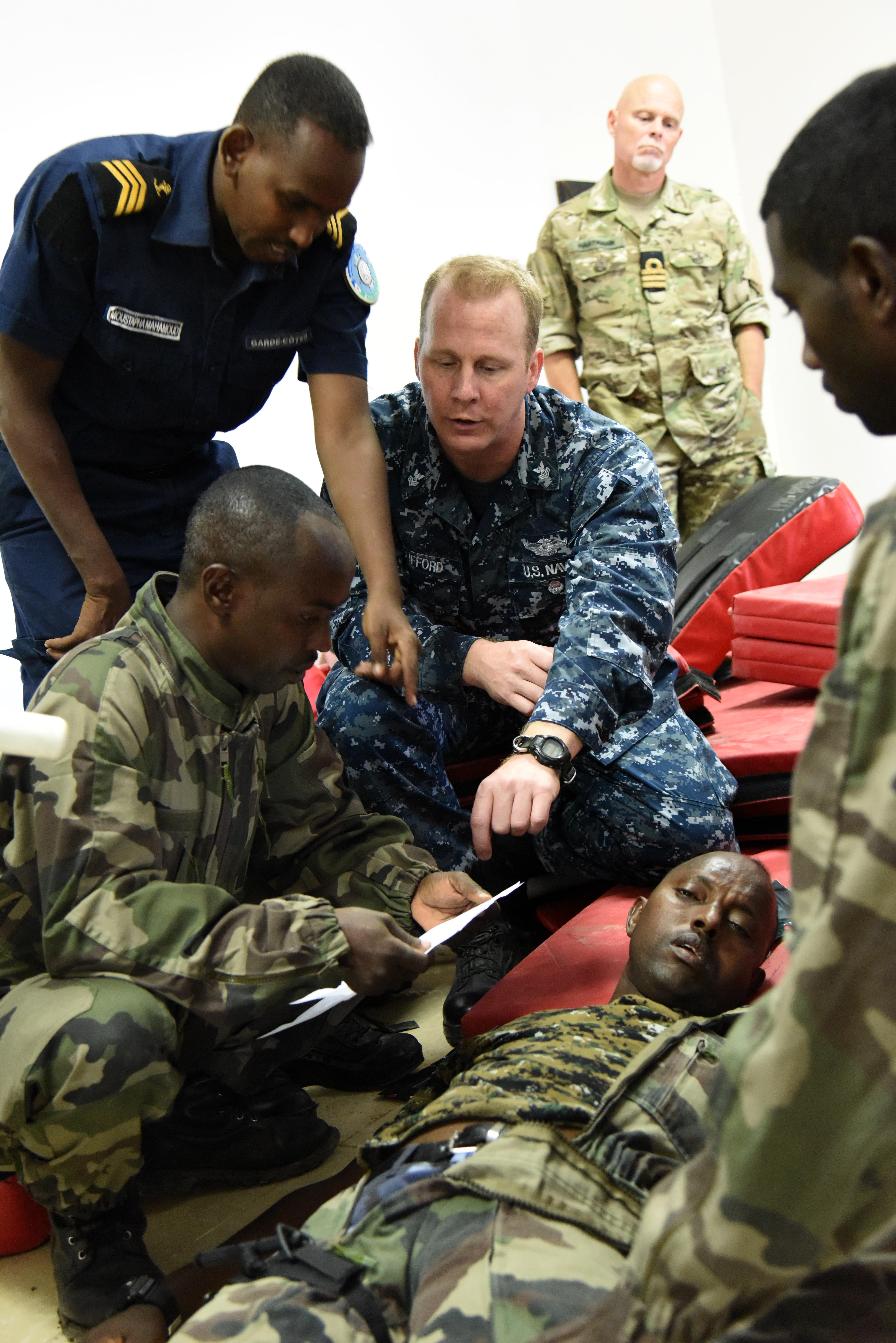 U.S. Navy Hospital Corpsman First Class Aaron Clifford, Cutlass Express medical instructor, explains how to treat a sucking chest wound on a simulated patient to Djibouti Coast Guardsmen and Marines during classroom instruction for exercise Cutlass Express Jan. 31, 2016, at the Djiboutian Coast Guard Academy, Djibouti. Exercise participants conducted a number of maritime security operations to include vessel queries, ship boarding, airborne maritime patrol operations, and search and rescue drills.