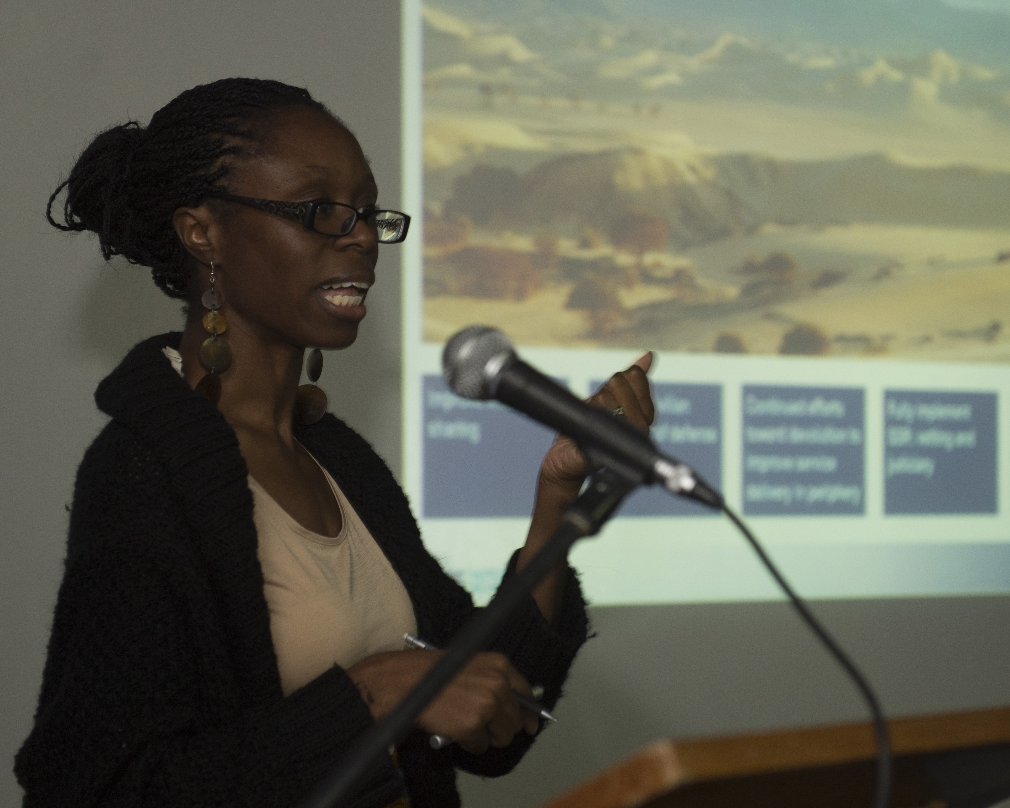 Dr. Yolanda Bouka, Africa Center for Strategic Studies guest speaker, discusses Burundi current events Mar. 3, 2016, at Camp Lemonnier, Djibouti. More than 70 members of the Combined Joint Task Force-Horn of Africa staff attended a workshop led by six representatives from the U.S., Europe and Africa. The speakers were selected by the ACSS to discuss topics including violent extremism, peace and security architecture, and security challenges in specific countries for which they are subject matter experts. (U.S. Air Force photo by Staff Sgt. Peter Thompson)