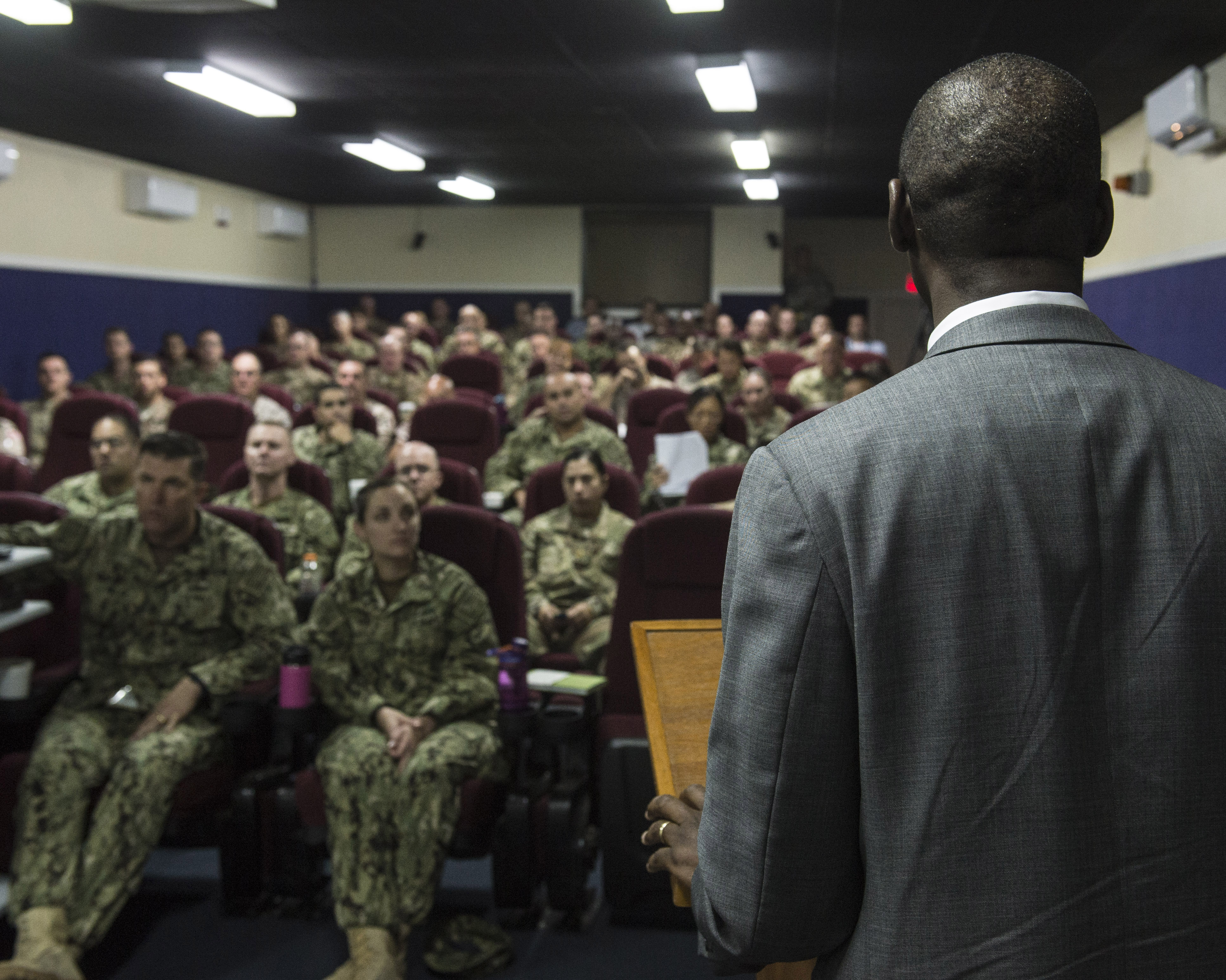 Dr. Raymond Gilpin, Africa Center for Strategic Studies academic dean, discusses African contemporary security trends Mar. 1, 2016, at Camp Lemonnier, Djibouti. The Africa Center for Strategic Studies is a Department of Defense organization dedicated to supporting U.S. foreign and security policies. Combined Joint Task Force-Horn of Africa hosted the ACSS to discuss current issues and to learn more about the countries in East Africa. (U.S. Air Force photo by Staff Sgt. Peter Thompson)