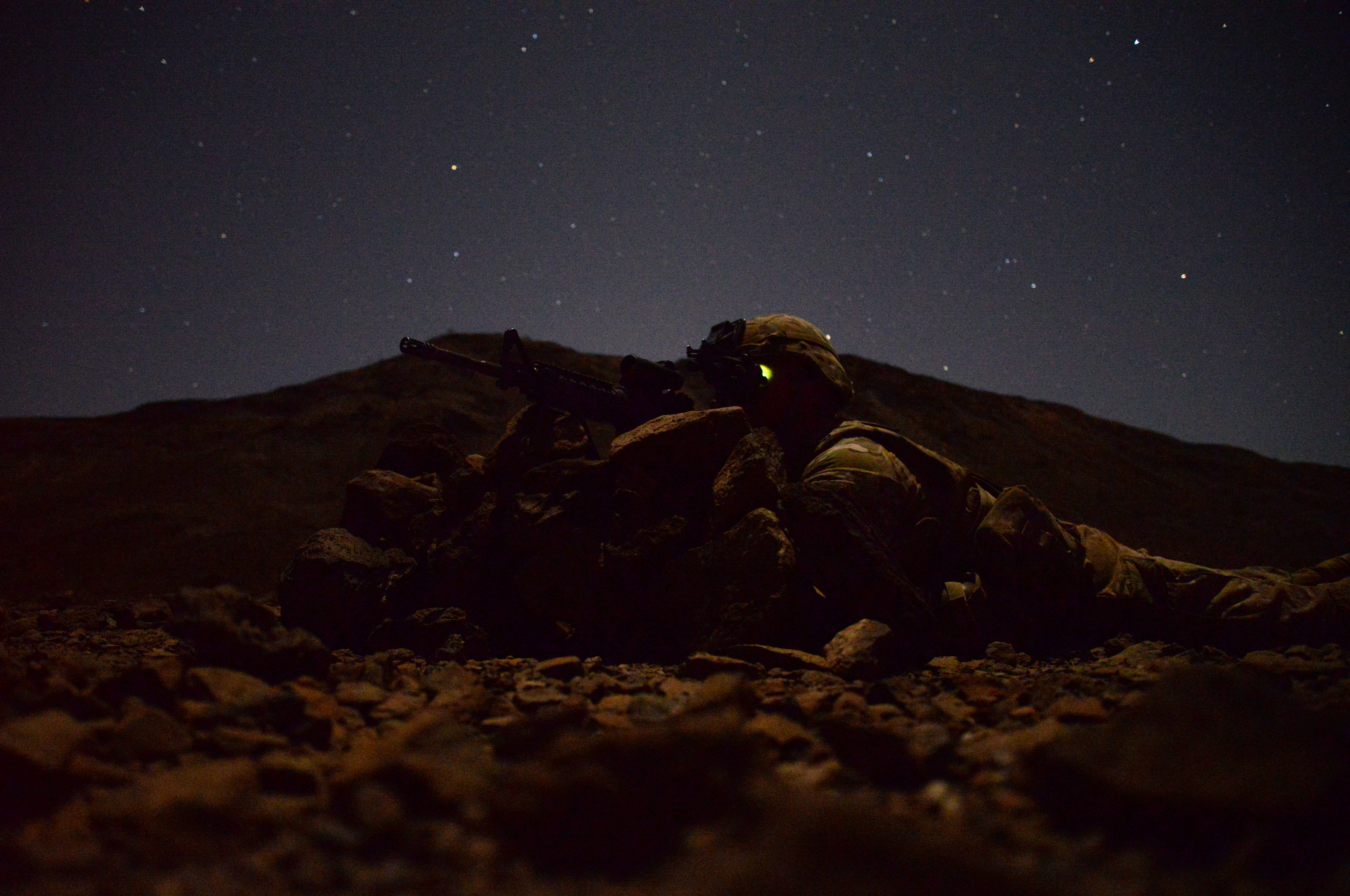 U.S. Army Spc. Micah Whitten, 2-124 Seminole Battalion infantry member, watches his area of responsibility during a field training exercise March 16, 2016, in Arta, Djibouti. The Soldiers received attacks throughout the night from simulated opposing forces, requiring the Soldiers to quickly take action to defend their post. (U.S. Air Force photo by Staff Sgt. Kate Thornton)