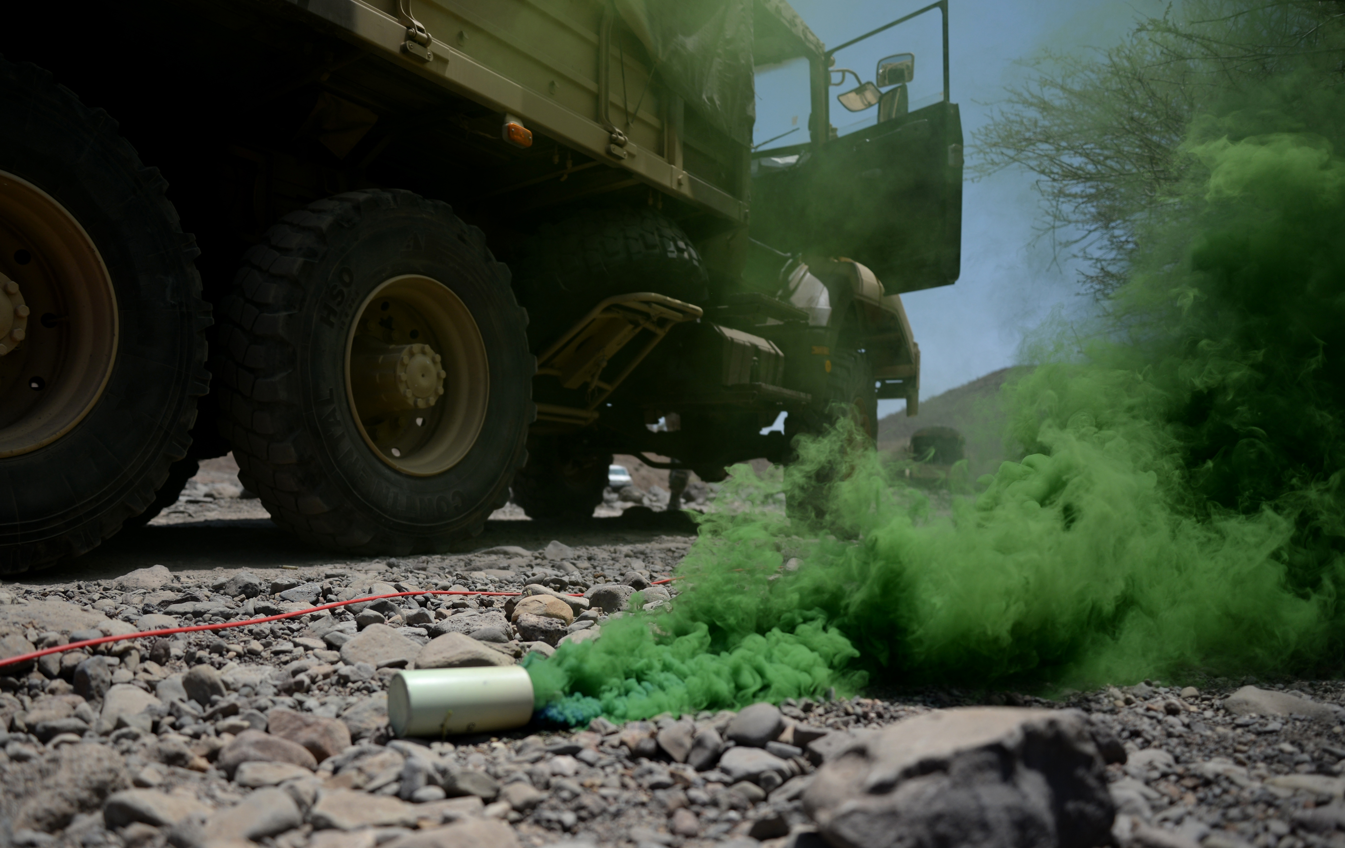 A smoke can indicates a simulated improvised explosive device attack March 17, 2016, during a field training exercise in Arta, Djibouti. Several Soldiers were simulated as injured to test the rest of the team’s ability to react under pressure and provide combat lifesaving techniques. (U.S. Air Force photo by Staff Sgt. Kate Thornton)