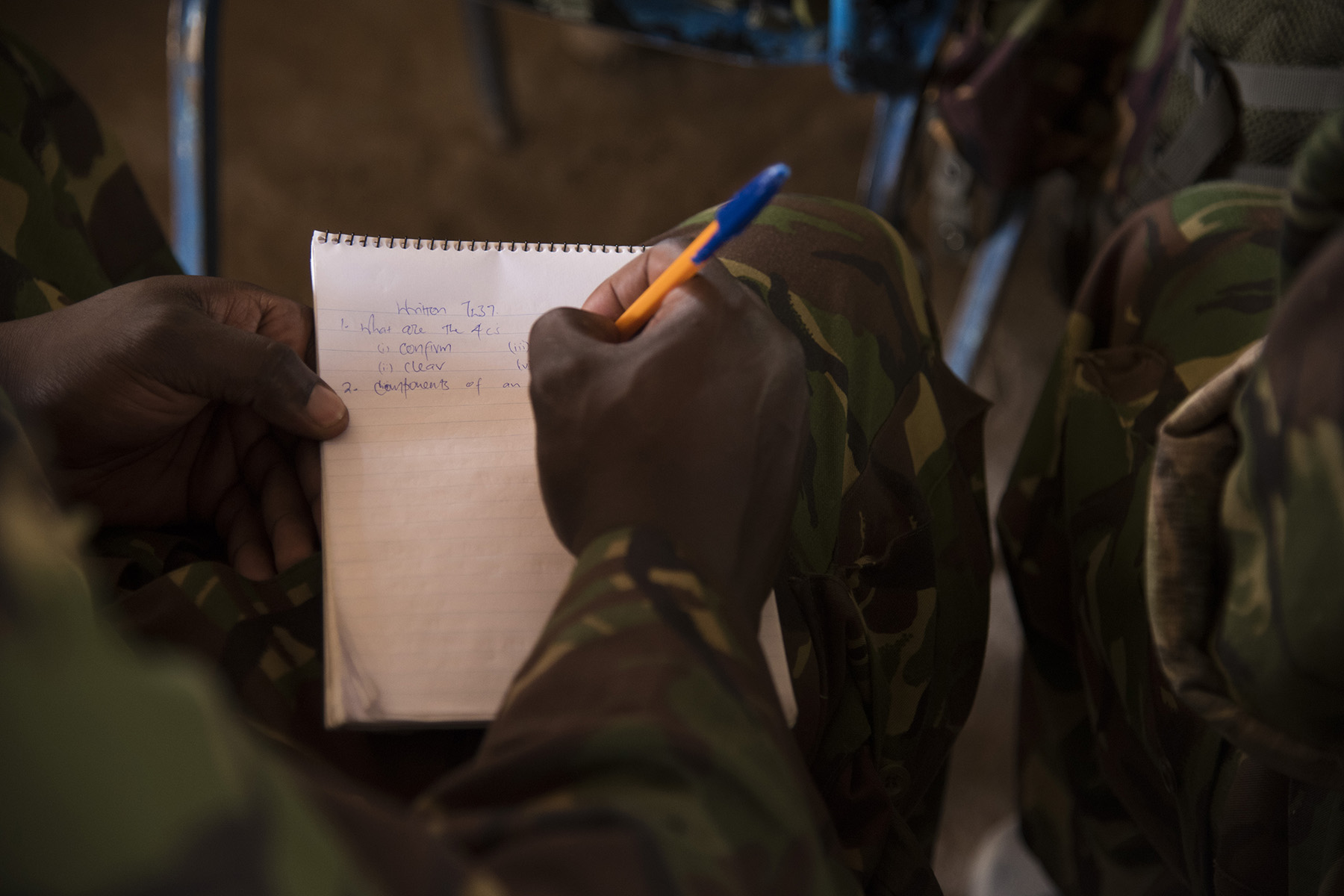 KENYA- Kenya Defense Forces combat engineer soldiers and officers complete a written test at the end of their second week of class during Deliberate Kindle 2016, Sept. 16, at a training center in Kenya. U.S. Navy Task Force Sparta explosive ordnance disposal technicians and a dive independent duty corpsman, assigned to Combined Joint Task Force-Horn of Africa, provided counter-improvised explosive device, tactical combat medical care, and train-the-trainer skills to approximately 53 KDF soldiers and officers in preparation the KDF’s deployment with the African Union Mission in Somalia. (U.S. Air Force photo by Staff Sgt. Tiffany DeNault)