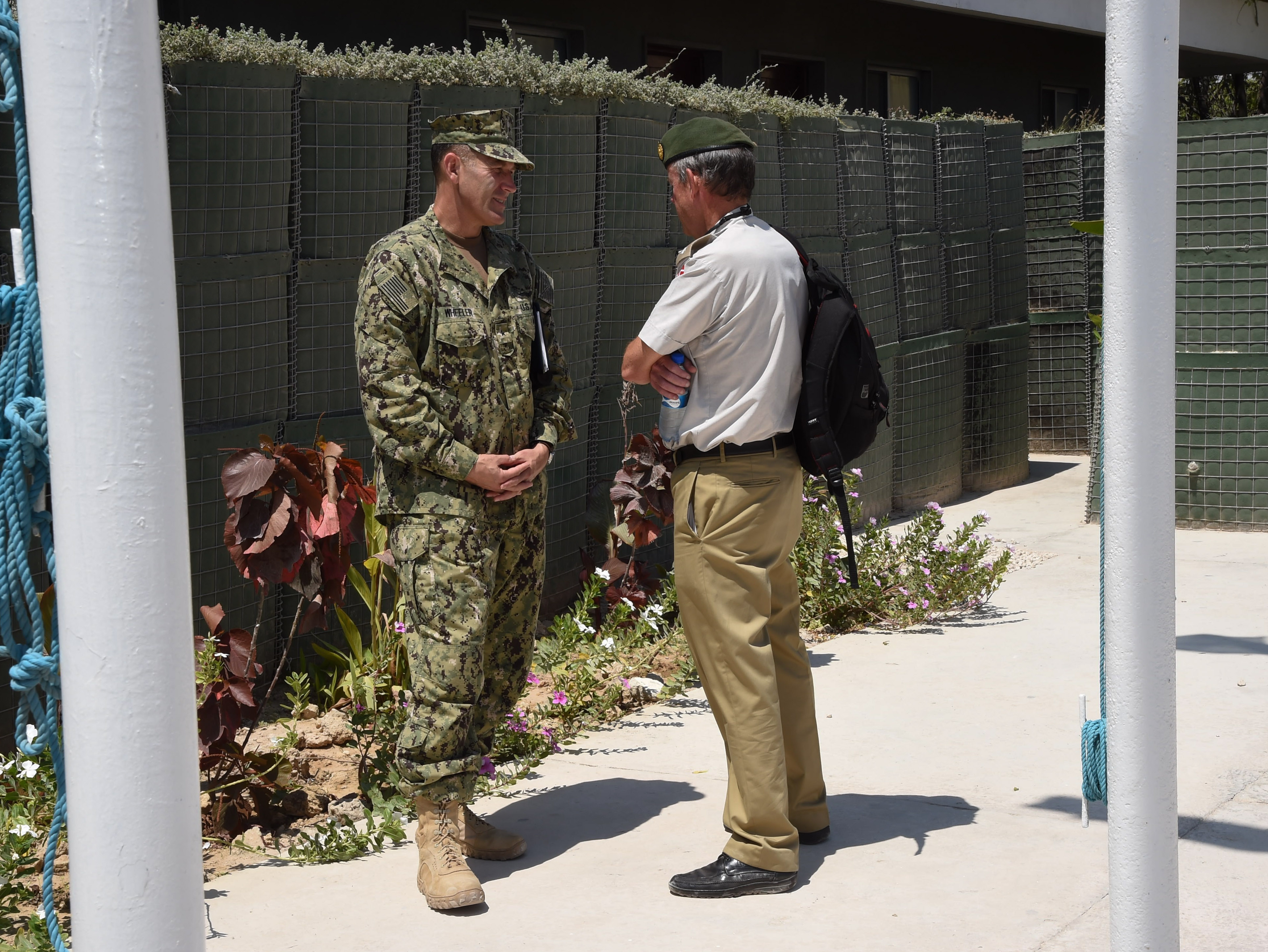 U.S. Navy Rear Adm. William Wheeler III, deputy commander of Combined Joint Task Force-Horn of Africa (CJTF-HOA), and Col. Søren Knudsen, Military Advisor to the Royal Danish Embassy and Defense Attaché Kenya, Nairobi, converse after a defense steering committee meeting, Nov. 3, 2016, in Mogadishu, Somalia. The venue allowed members to discuss Somalian defense security situations, AMISOM challenges, and the current dynamics seen by all sides. These meetings align with the CJTF-HOA mission of supporting and enabling the stabilization of Somalia. (U.S. Air Force photo by Staff Sgt. Penny Snoozy)