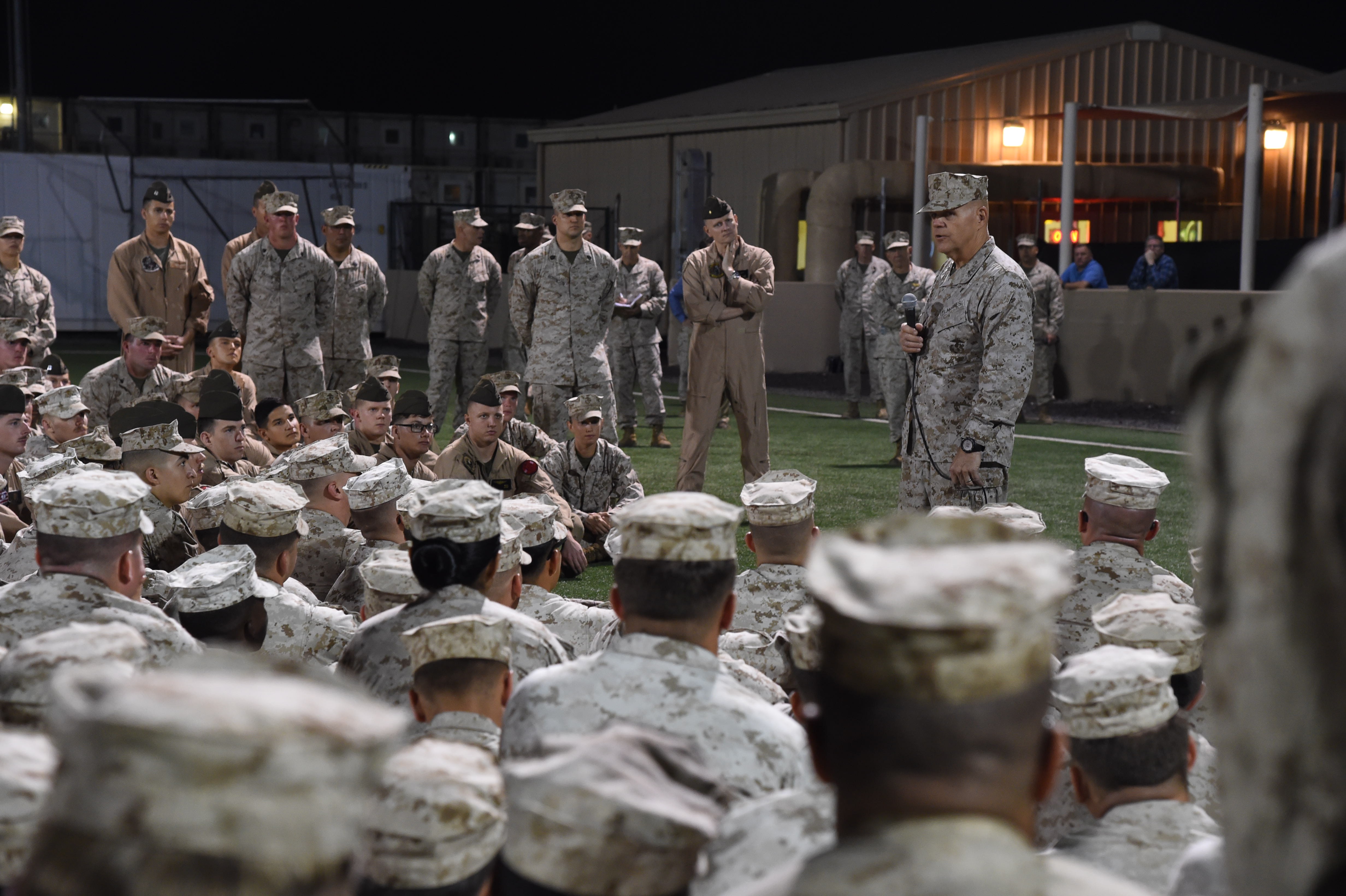U.S. Marine Corps Gen. Robert B. Neller, 37th Commandant of the Marine Corps, speaks with Special Purpose Marine Air Ground Task Force-Crisis Response-Africa Marines and Sailors about the importance of their mission to preserve the assets of U.S. and partner-nations at Camp Lemonnier, Djibouti, Dec. 23, 2016. The SP-MAGTF is a ready force capable of providing support to U.S. embassies, conducting non-combatant evacuation, humanitarian assistance, disaster relief, and crisis response. (U.S. Air National Guard photo by Staff Sgt. Penny Snoozy)