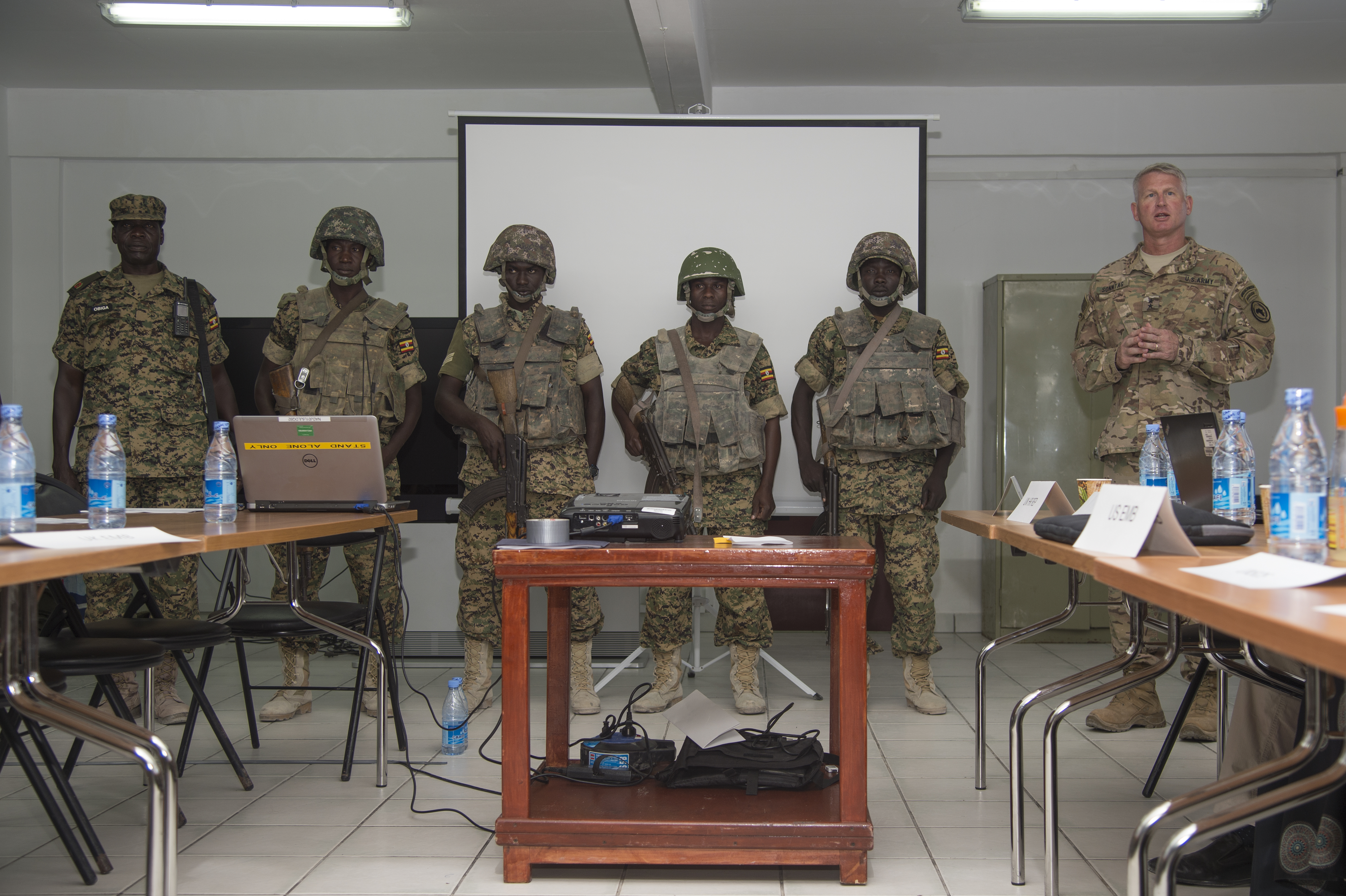 Maj. Gen. Kurt Sonntag, commanding general of the Combined Joint Task Force-Horn of Africa, right, recognizes members of the Ugandan military responsible for defeating a vehicle borne IED attack while serving with the African Union Mission in Somalia during the SNA Symposium in downtown Mogadishu, Jan. 11, 2017. AMISOM is an active, regional peacekeeping mission operated by the African Union with the approval of the United Nations in Somalia.