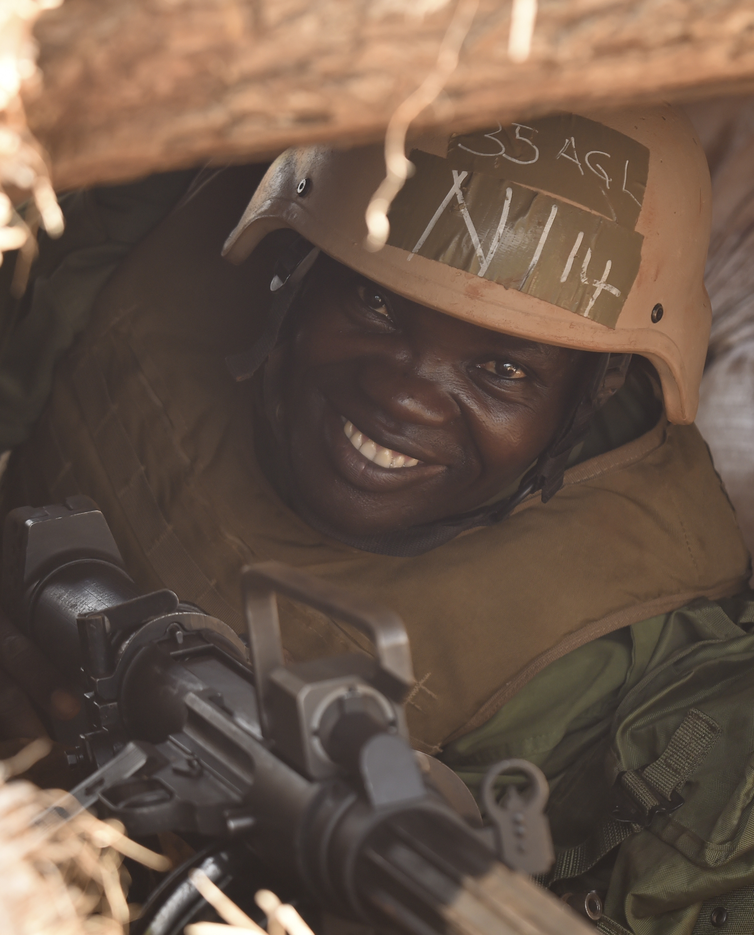 A Uganda People’s Defense Force soldier, Ugandan Battle Group 22 (UGABAG 22), sits in a bunker before a live fire exercise at Camp Singo, Uganda, Feb. 27, 2017. UGABAG 22 will perform common task training, a combat lifesaver course, counter improvised-explosive-device training, and live fire training as a part of their pre-deployment preparation. (U.S. Air National Guard photo by Staff Sgt. Penny Snoozy)