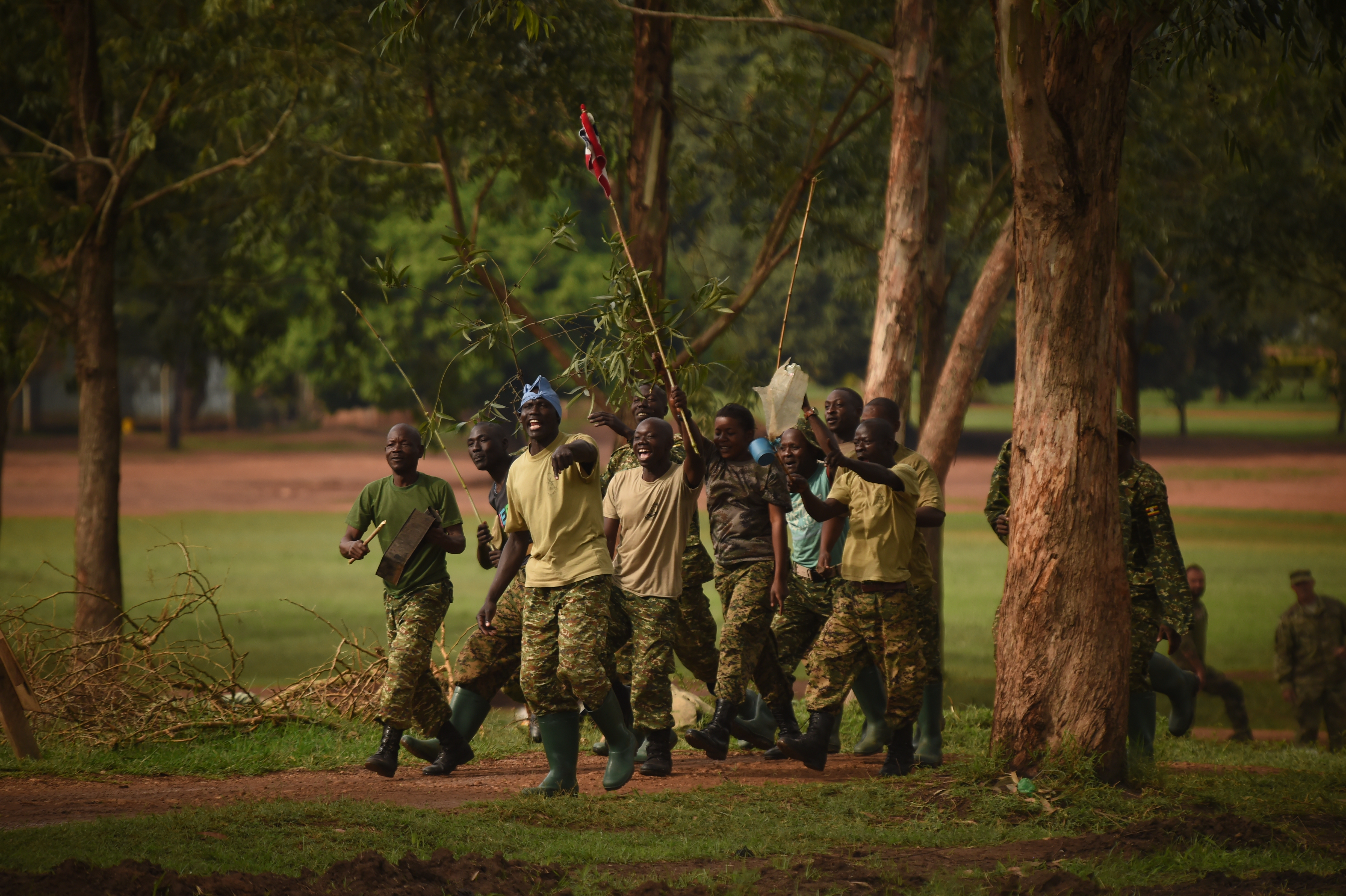 Uganda People’s Defense Force (UPDF), Ugandan Battle Group 22 soldiers simulate a riot during an exercise at Camp Singo, Uganda, March 1, 2017. The exercise allowed evaluators to critique and validate the appropriate response from UPDF. (U.S. Air National Guard photo by Staff Sgt. Penny Snoozy)