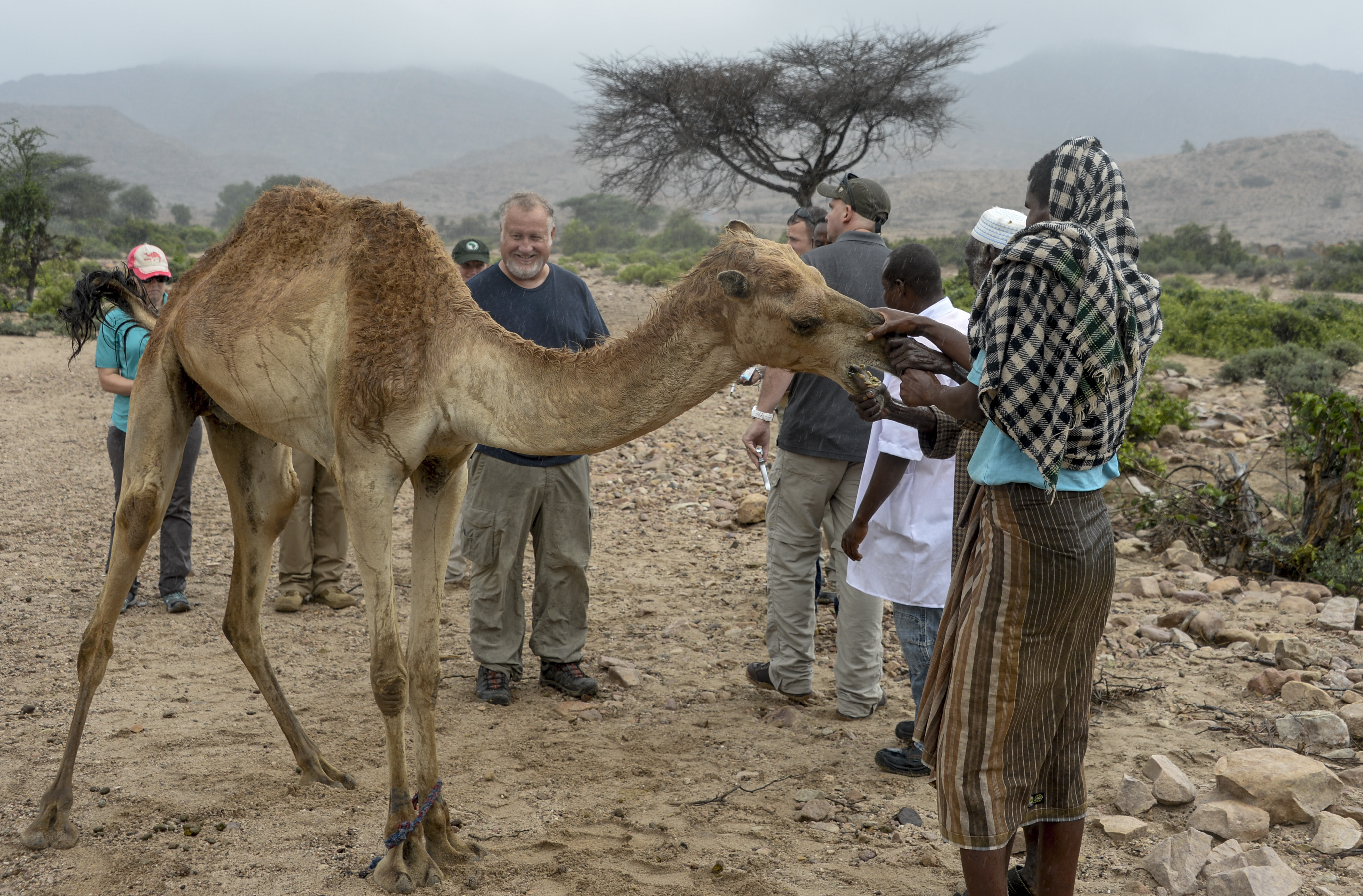 A Djiboutian shepherd subdues his camel while U.S. Army 418th Civil Affairs Battalion Function Specialty Unit (FxSP) personnel treat his livestock during a veterinarian assistance mission outside of Ali Sabieh, Djibouti, March 28, 2017. The veterinarian assistance mission is intended to enhance the capabilities of local animal health workers, ensure animal herd well-being, and strengthen agricultural and economic stability, while fostering positive relationships between the U.S. and partner nations. (U.S. Air National Guard photo by Staff Sgt. Christian Jadot)