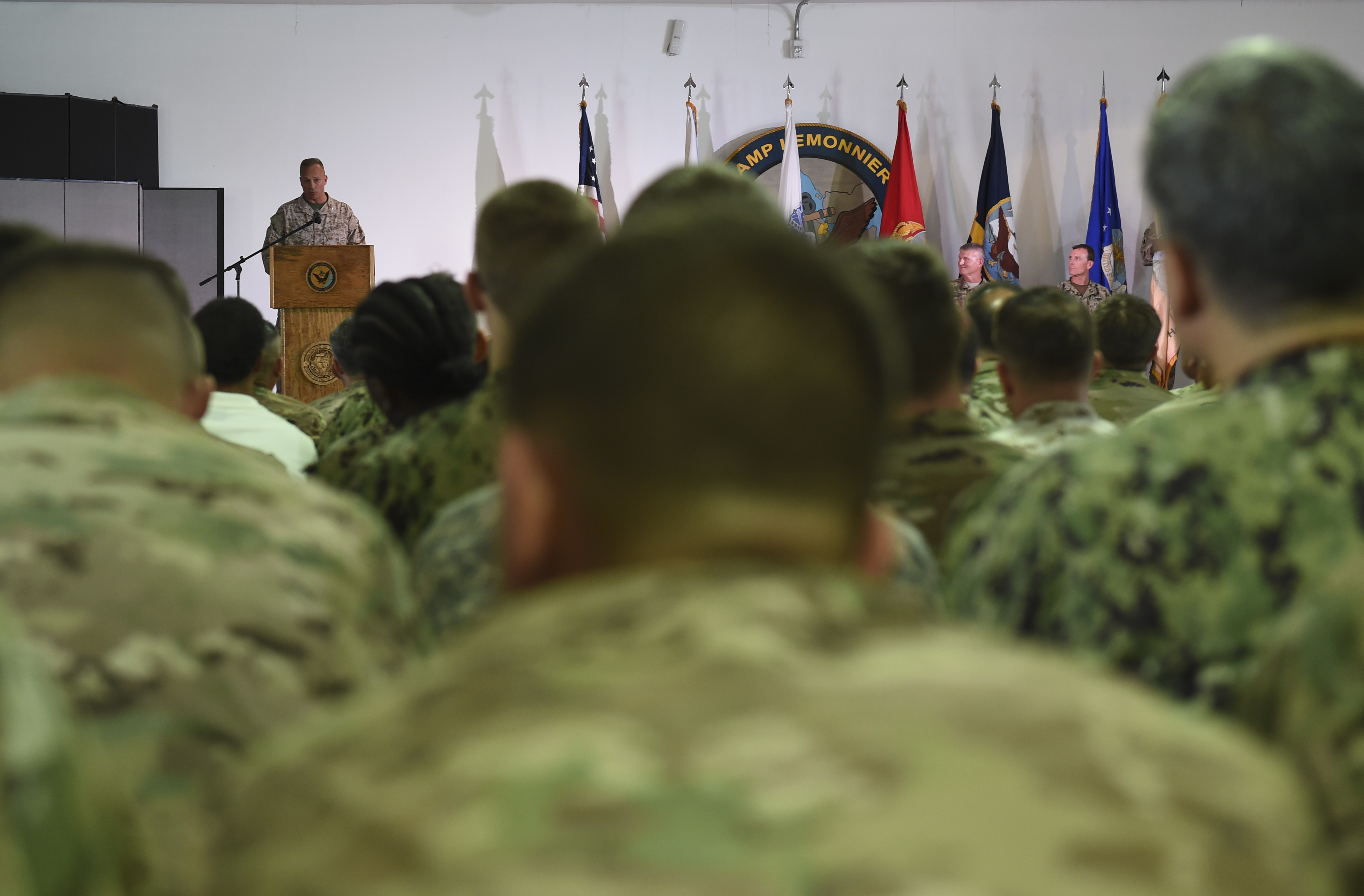 U.S. Marine Corps Brig. Gen. David J. Furness Combined Joint Task Force - Horn of Africa commander, addresses the audience during the change of command ceremony on Camp Lemonnier in Djibouti, April 28, 2017. Furness is responsible for overseeing CJTF-HOA’s efforts in countering transnational threats in East Africa, fostering regional security cooperation, and ultimately promoting regional stability and prosperity. (U.S. Air Force Photo by Eboni Prince)