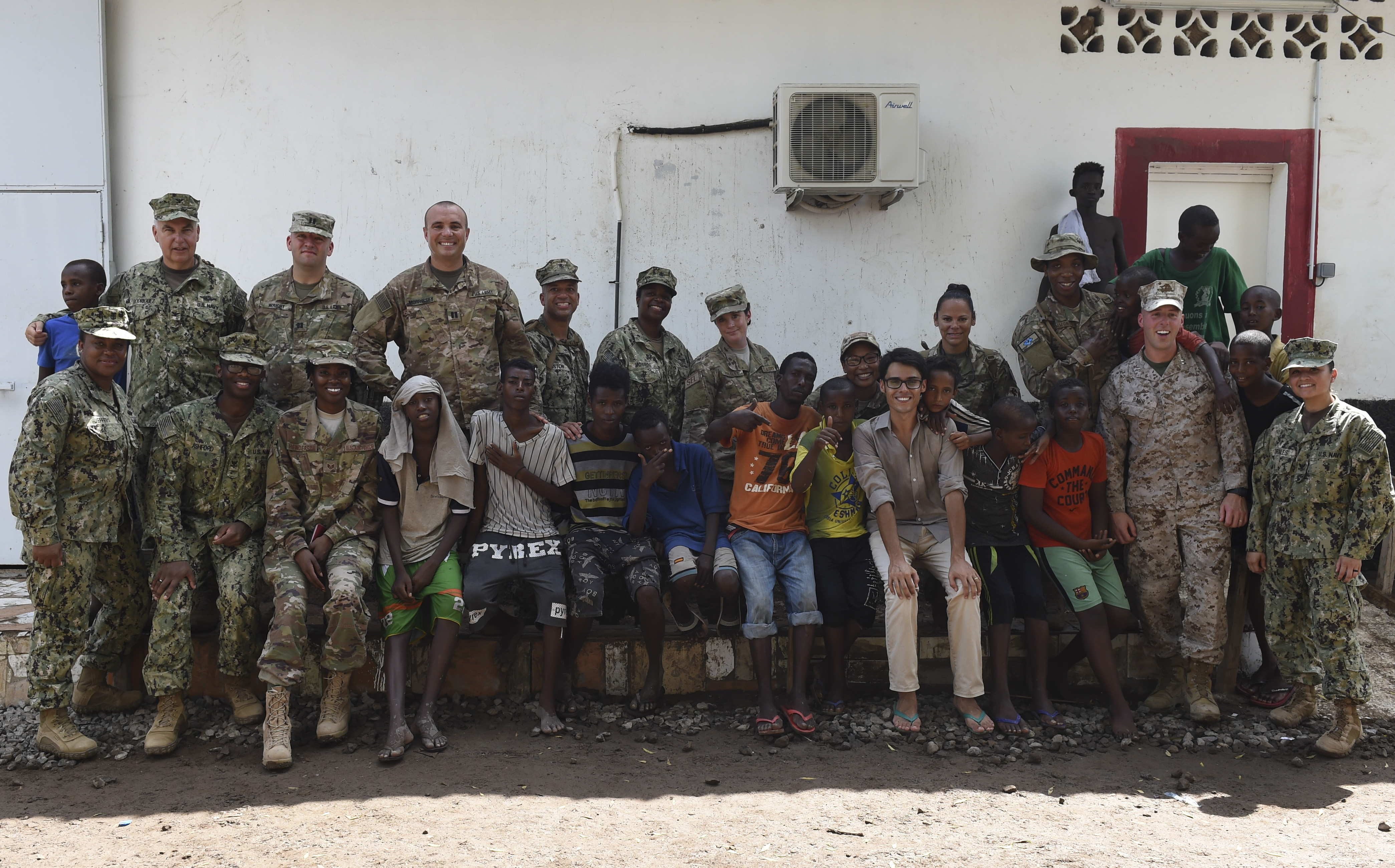 Children from Caritas Djibouti pose for a photo with service members from Camp Lemonnier, in downtown Djibouti, May 16, 2017. U.S. Service members assigned to the Combined joint Task Force - Horn of Africa, periodically visit with the mission to donate food items, toys, clothing and supplies. (U.S. Air Force photo by Eboni Prince)