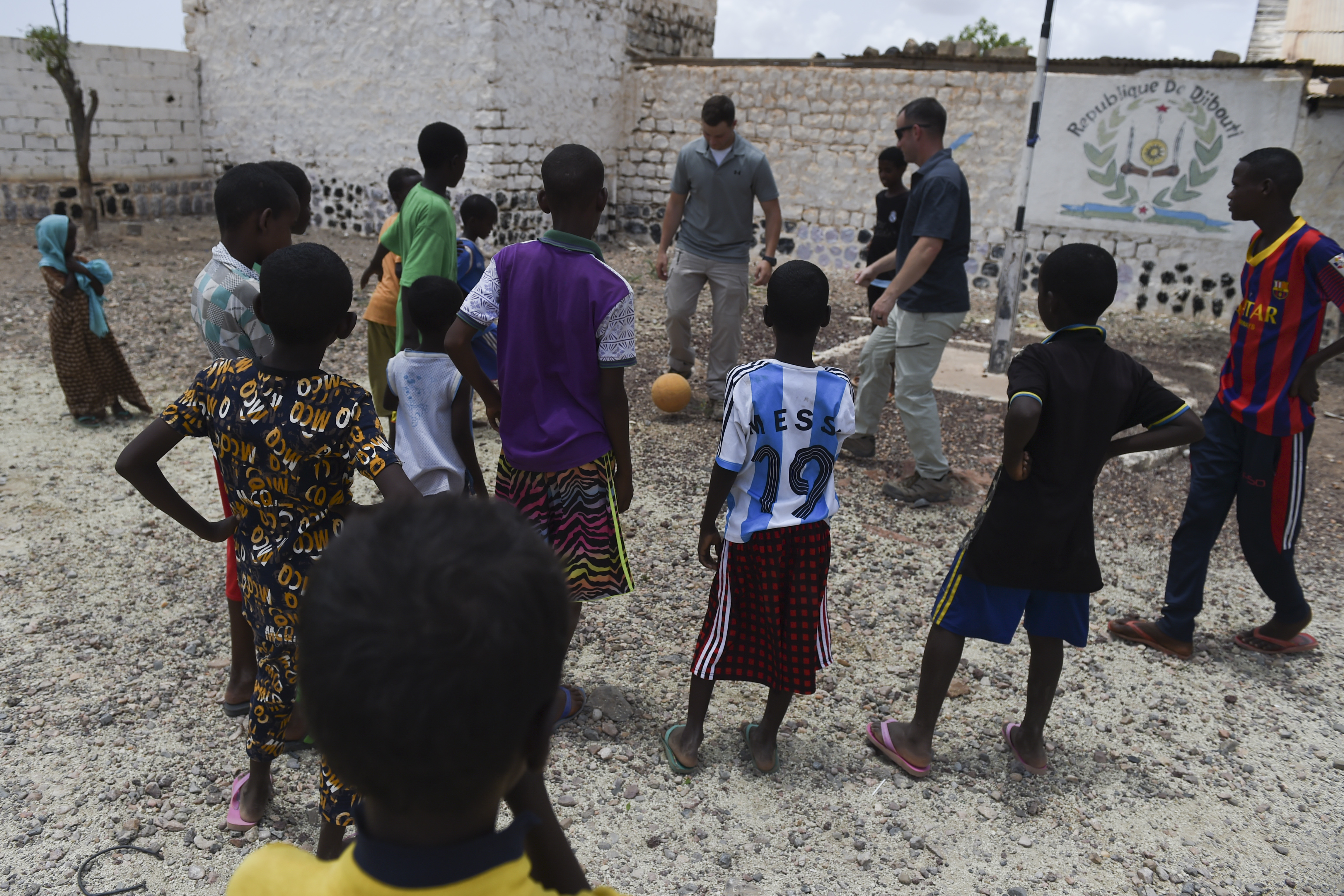 U.S. Army Sgt. Grady Kissee and Sgt. Robert Hawkins, both assigned to the Combined Joint Task Force-Horn of Africa, Military Information Support Operations, play soccer with children in the village of Holhol, Djibouti, May 18, 2017. Tactical Psychological Operations team members travelled with the 411th Civil Affairs Battalion, Bravo Company, Civil Affairs Team 3, to the village of Holhol to conduct a counter violent extremism assessment in support of the Combined Joint Task Force- Horn of Africa’s effort to neutralize violent extremist organizations to create a stable, secure environment in East Africa. (U.S. Air Force Photo by Eboni Prince)