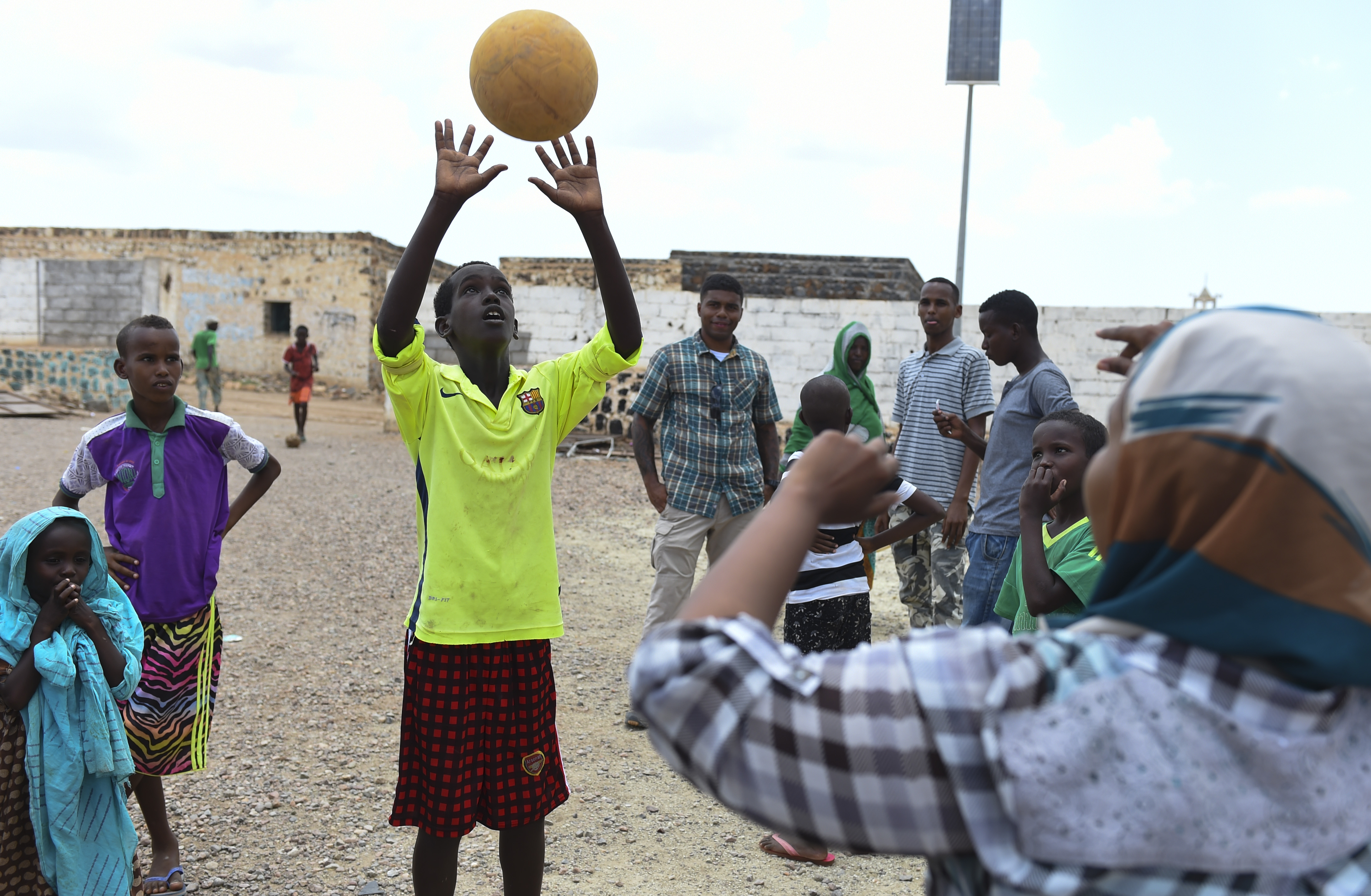 A child tosses a ball with Fatouma Omar Guedi, a language interpreter, in the village of Holhol, Djibouti, May 18, 2017. Language interpreters are essential to the success of civil affairs operations and act as liaisons between the military personnel and local key leaders in the Horn-of-Africa nations. (U.S. Air Force Photo by Eboni Prince)