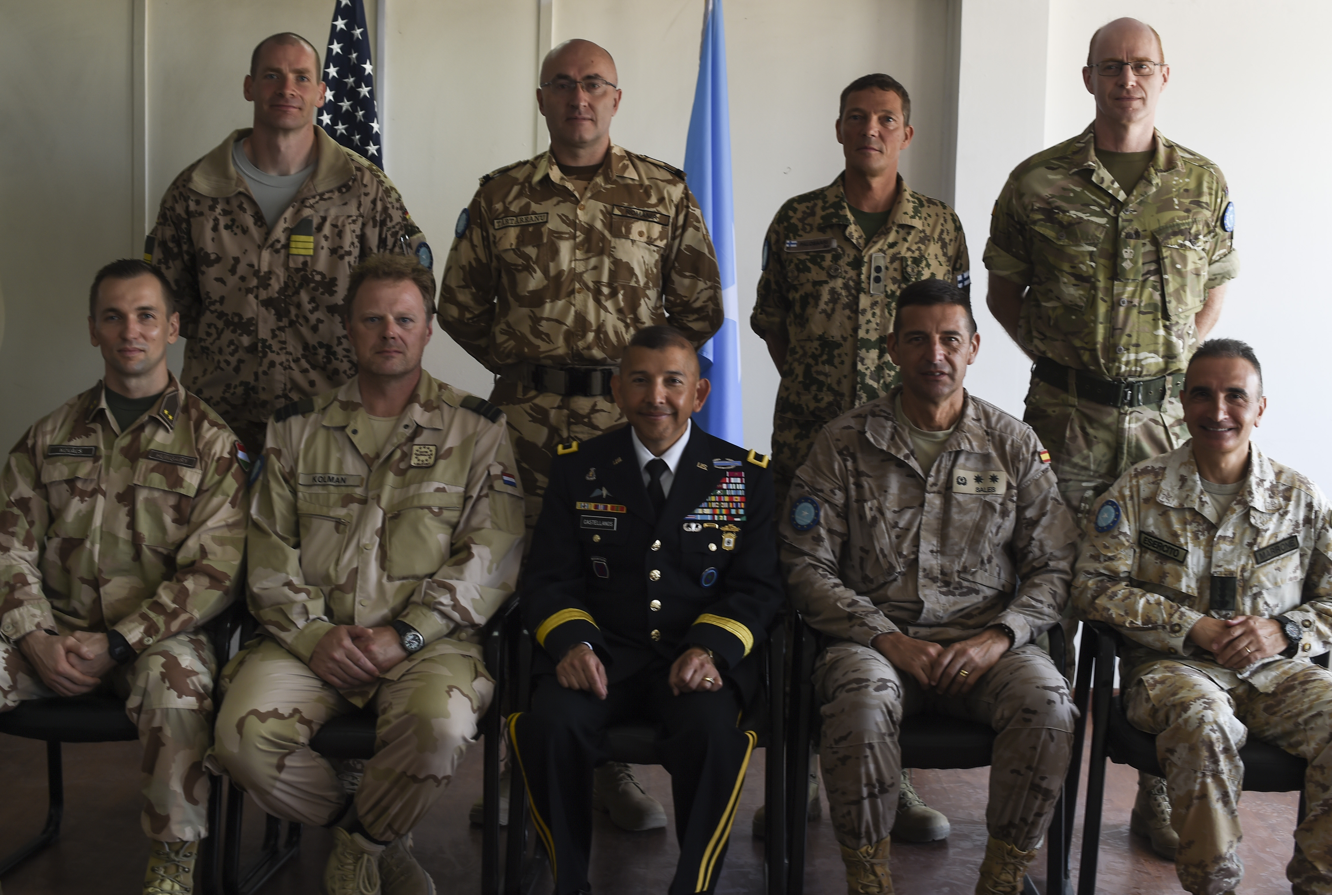 U.S. Army Brig. Gen. Miguel Castellanos (bottom, center), Combined Joint Task Force-Horn of Africa deputy commanding general in Somalia and Mogadishu Coordination Cell director, is seated with international military partners at the MCC, June 4, 2017. Castellanos works from the Mogadishu International Airport compound with his team to support combined military efforts to achieve U.S. Africa Command's top priority of defeating Al-Shabaab in Somalia and successfully transitioning security functions to Somali National Security Forces. (U.S. Air Force photo by Staff Sgt. Eboni Prince)