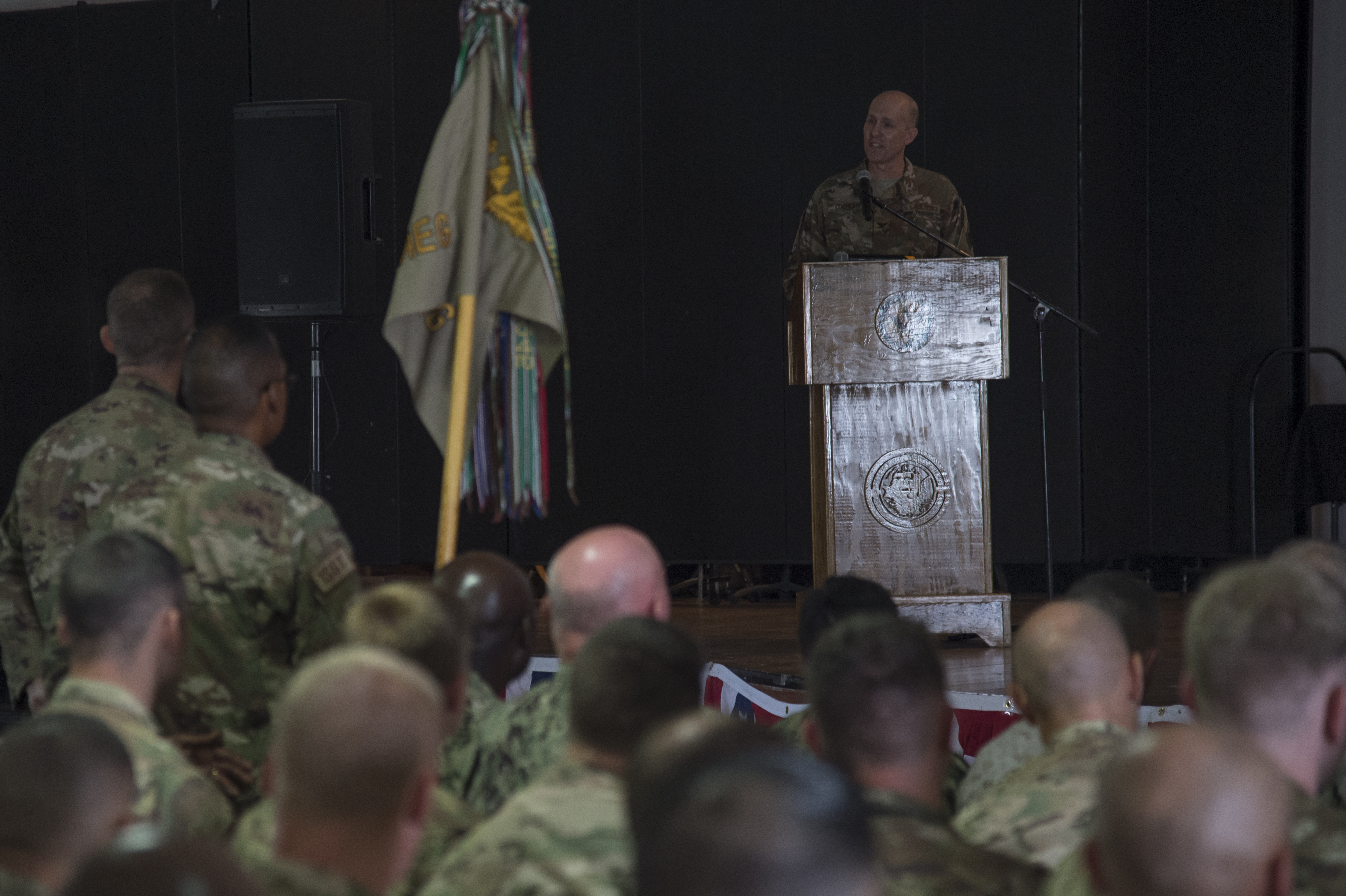 U.S. Air Force Col. Shawn Cochran, 449th Air Expeditionary Group incoming commander, speaks to the crowd during the 449th AEG Change of Command ceremony June 9, 2017, at Camp Lemonnier, Djibouti. Cochran is relieving U.S. Air Force Col. Michael Bruzzini who has served as the 449th AEG Commander since June 6, 2016. The passing of the flag is a military tradition signifying the change of authority and responsibility of a unit from one commander to another. (U.S. Air National Guard Photo by Tech. Sgt. Joe Harwood)