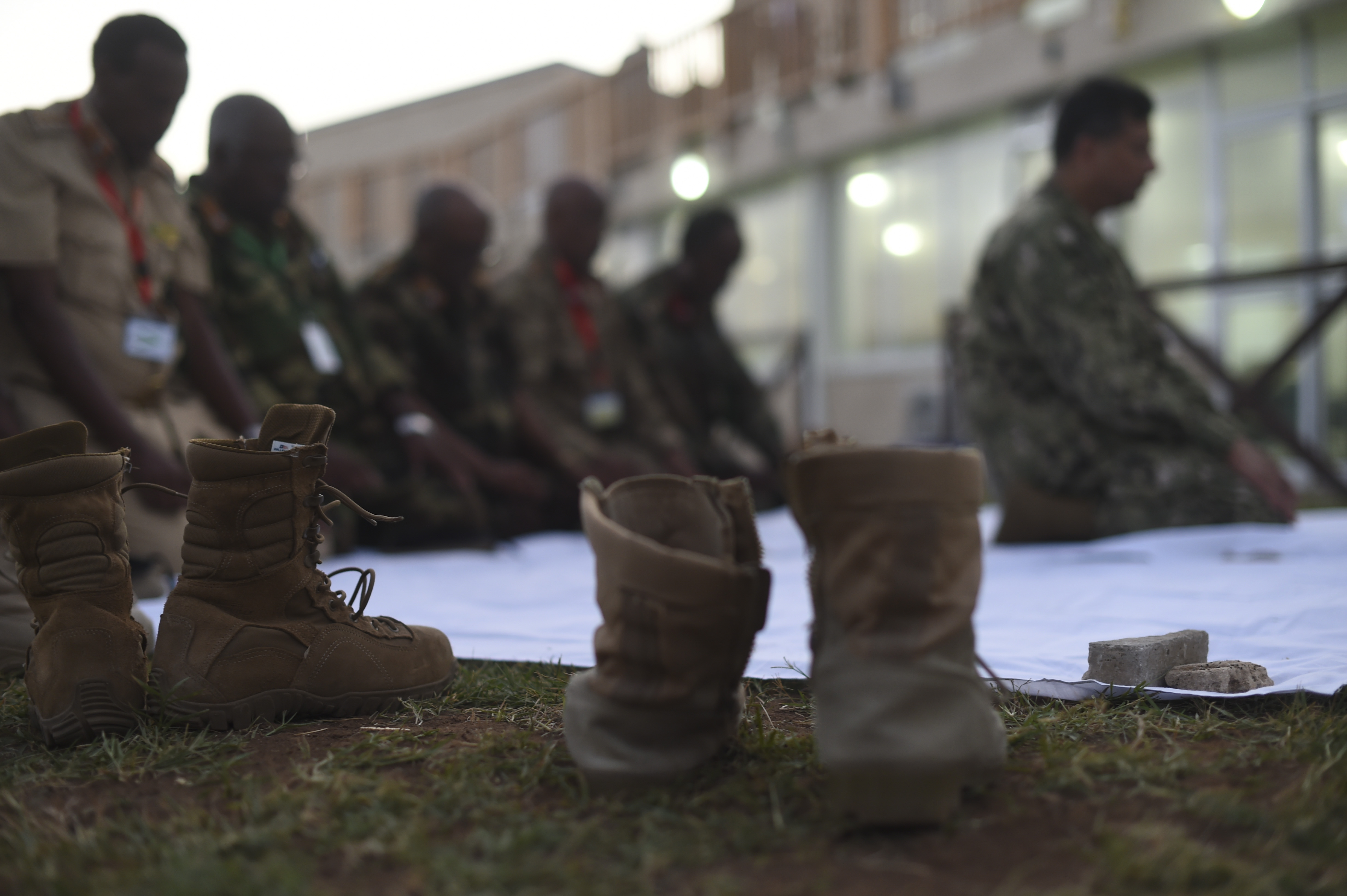 Military boots rest near a sheet placed on the ground for a prayer before an Iftar with members of the Somali National Army at the Mogadishu International Airport, Mogadishu, Somalia, June 5, 2017. This was the first Iftar held between U.S. and SNA military personnel. Additionally, it was the first led by a U.S. Imam, who is a leader in the Islamic faith. (U.S. Air Force Photo by Staff Sgt. Eboni Prince)