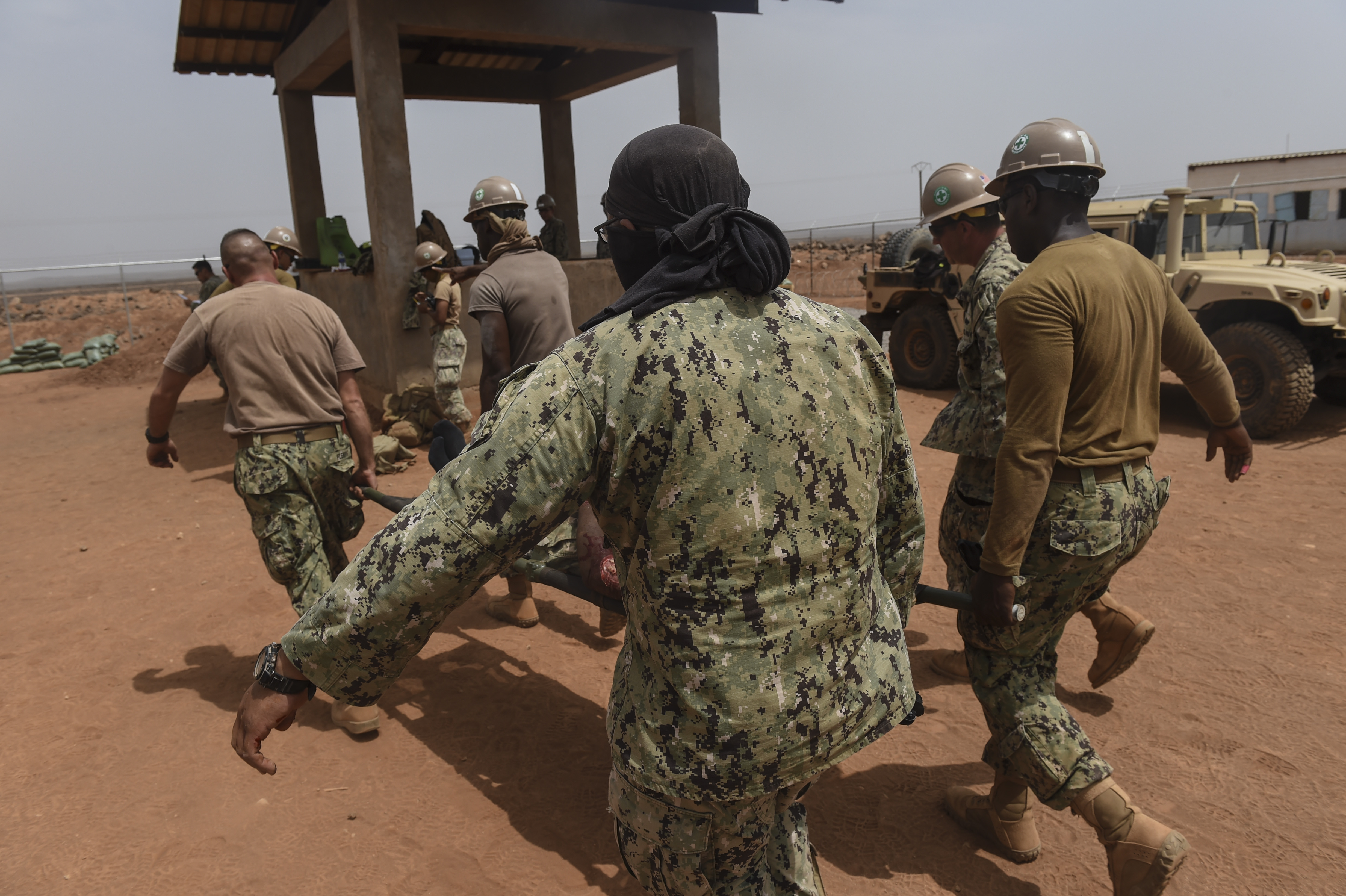 Members of the U.S. Naval Mobile Construction Battalion One, a maneuver unit of the Combined Joint Task Force-Horn of Africa, carry a patient on a litter during a bilateral exercise with French forces in the Arta region, July 19, 2017. This bilateral training was the first execution of medical evacuation procedures with French military personnel and increases the ability of all participants to plan, communicate and execute complex operations. (U.S. Air Force photo by Staff Sgt. Eboni Prince)