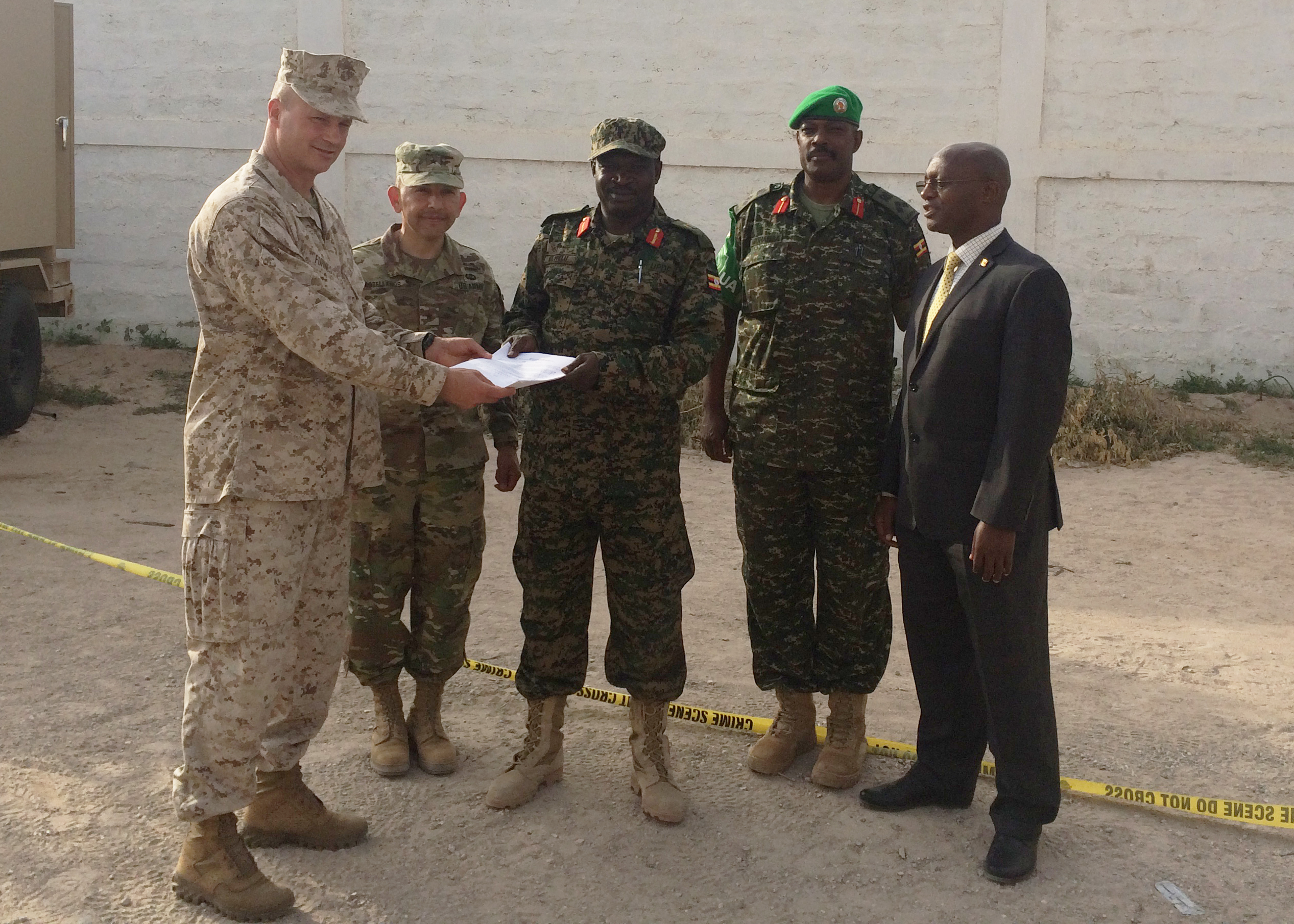 Combined Joint Task Force-Horn of Africa commander U.S. Marine Brig. Gen. David Furness and U.S. Army Brig. Gen. Miguel Castellanos, deputy commanding general for CJTF-HOA in Somalia and Mogadishu Coordination Cell director, hand over documentation of U.S. military force protection assets that are being provided to Uganda People’s Defense Force (UPDF) July 25, at the Mogadishu Coordination Cell, Somalia.