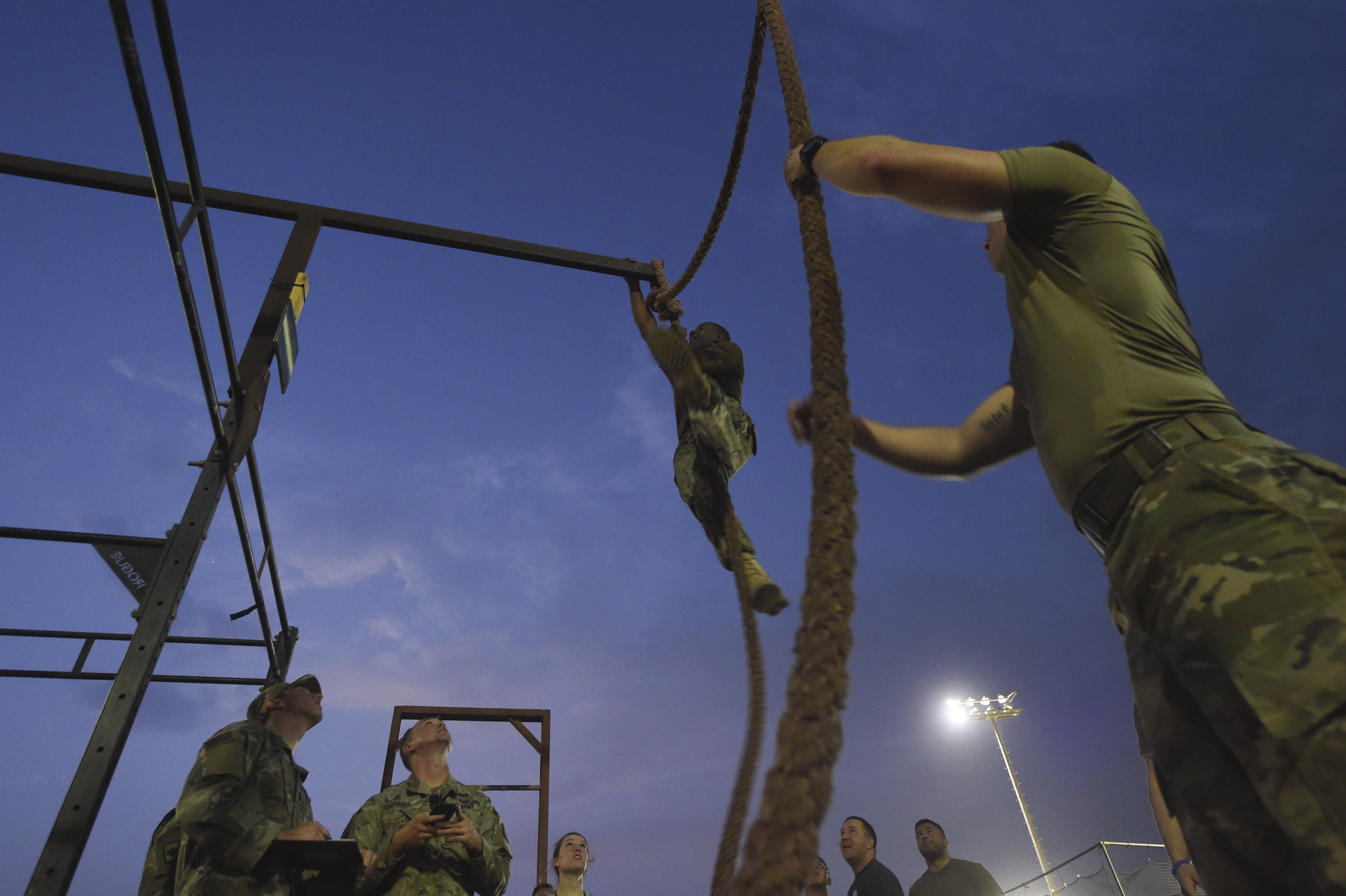 A U.S. service member completes a rope climb during a physical training test at Camp Lemonnier, Djibouti, Aug. 5, 2017. The test was in preparation for an upcoming multi-day French Desert Commando Course that will challenge participants physically and mentally through land and water obstacles, combat scenarios and extreme endurance exercises while surviving in austere field conditions. (U.S. Air Force photo by Staff Sgt. Eboni Prince)