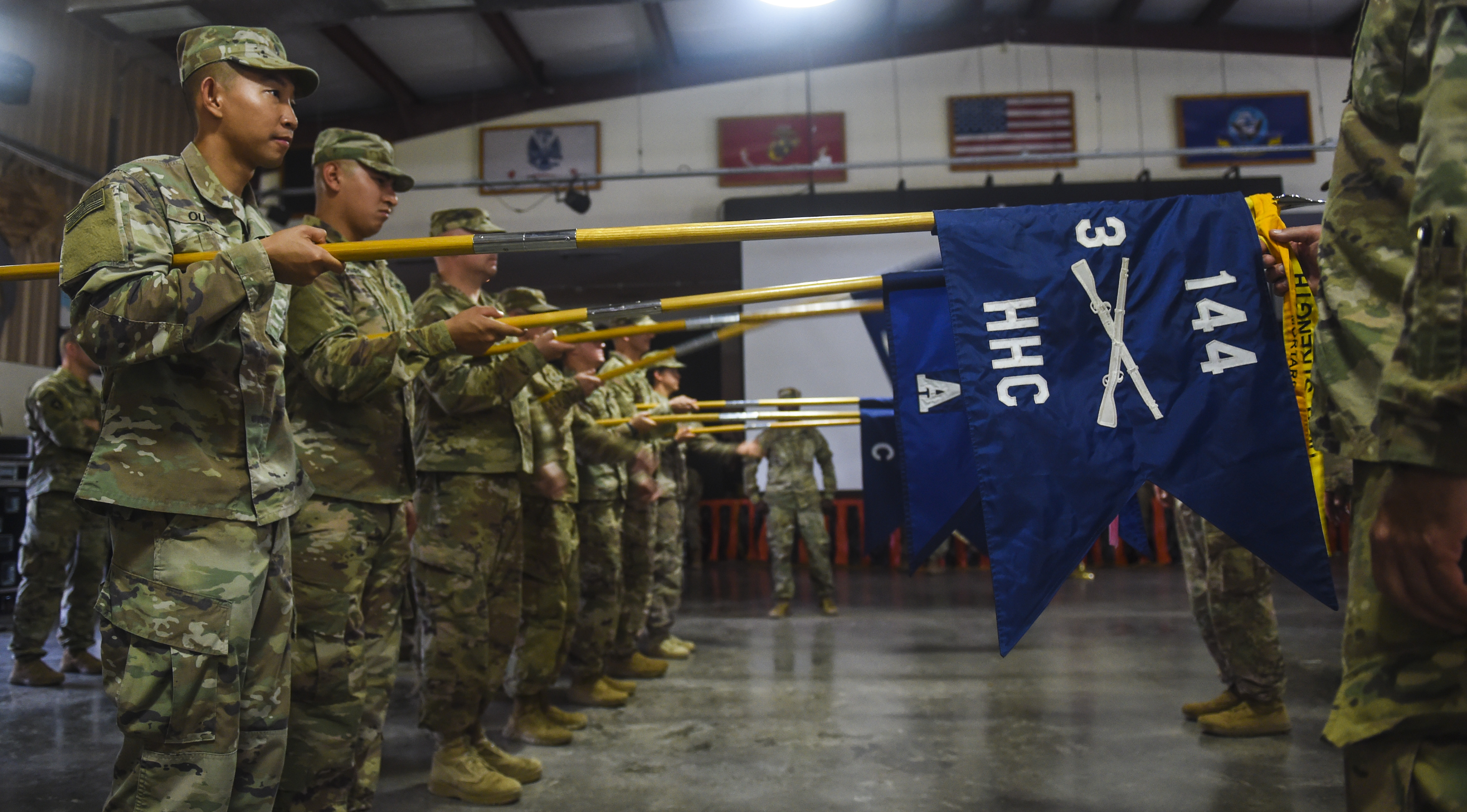 U.S. Army Soldiers assigned to the 3rd Battalion, 144th Infantry Regiment conduct rehearsals before a transfer of authority ceremony at Camp Lemonnier, Djibouti, Nov. 1, 2017. During the ceremony, the Soldiers officially took over the security force mission for the Combined Joint Task Force – Horn of Africa’s area of responsibility from the 1st Battalion, 153rd Infantry Regiment. (U.S. Air Force photo by Staff Sgt. Timothy Moore)